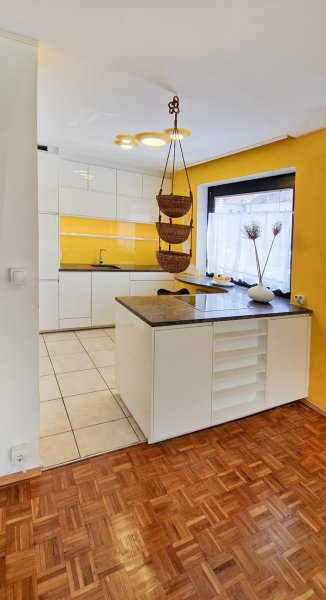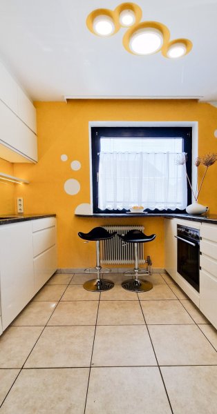 Durch die großen Fenster ist die Wohnung hell und sie ist extrem ruhig gelegen. Sie beinhaltet eine neuwertige Lackmöbel-Küche mit Granitsteinplatte. Die Küche ist zum Wohnzimmer offen.