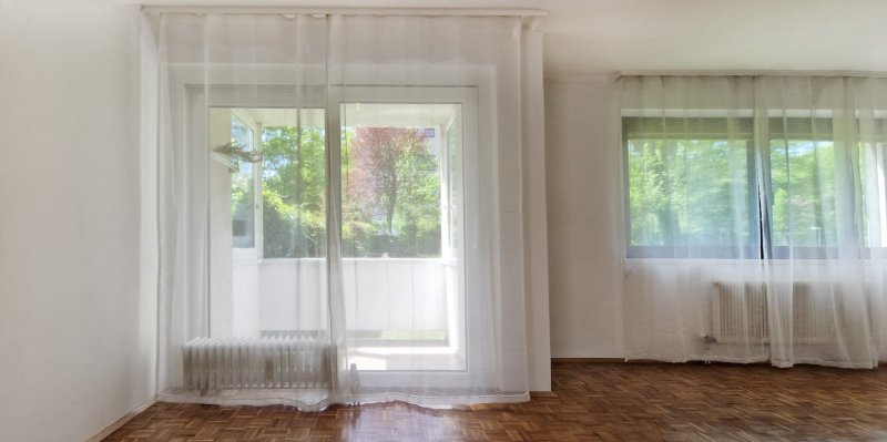 Durch letzteres gelangt man durch die dreifach verglaste Schiebetür auf den nachmittags sonnigen Balkon. Man blickt in die Grünanlage der Rothenhof-Siedlung, zu der auch die Wohnung gehört.