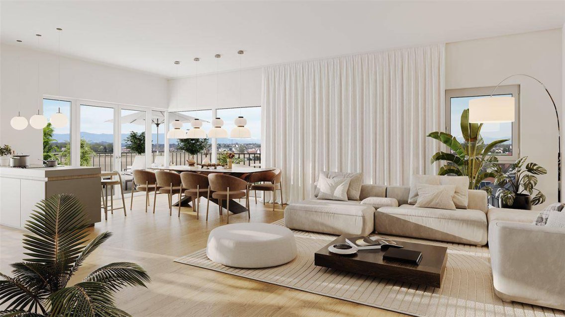 Licht spielt im Penthouse eine große Rolle. Schattenzeiten? Gibt es hier nicht! Stattdessen Sonne pur dank der optimalen Ausrichtung und der exklusiven Höhe, die jegliche Schatteneinwirkung anderer Häuser ausschließt. Genießen Sie die ersten Sonnenstrahlen am Morgen genauso wie die milde Abendsonne, wenn der Tag sich zu Ende neigt. Sollte Ihnen im Sommer zu warm werden, kein Problem: In der Wohnküche ist die Vorrichtung einer Klimaanlagenrohinstallation verfügbar.