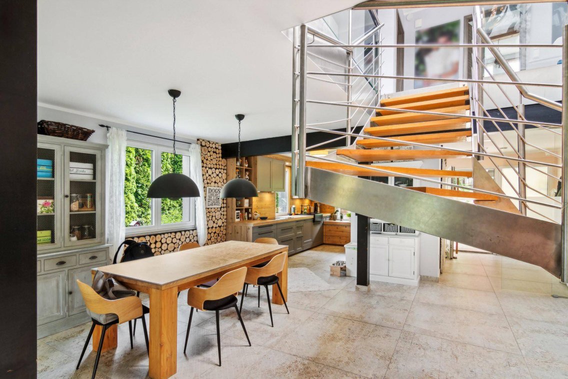 Für größere Familien mit besonderen Ansprüchen ist vermutlich diese idyllisch an einem Teich gelegene Villa mit paradiesischem Garten, Pool und separat zugänglicher Einliegerwohnung hervorragend geeignet. Die diese großzügige Immobilie versprüht ein außergewöhnliches, belebendes und zugleich entspanntes Wohngefühl für Groß und Klein. Eindrucksvoll gliedert sie sich mit ihren Glasfronten auf beiden Geschossen, drei Terrassen und drei Balkonen in die umliegende, wunderschöne Natur ein. Bambus- und Holzelemente unterstreichen den natürlichen Stil der Immobilie. Sie betreten das Anwesen von der Südseite aus, wo auch das Carport liegt und ein grün umwachsender, im Sommer blühender Pfad Sie zur Villa führt - vorbei an einem bunt und vielfältig angelegten, fantastisch duftenden Garten, an der Sonnenterrasse mit Pool gelangen Sie direkt zur gemütlichen Veranda und dem Haupteingang ins Haus. Das Erdgeschoss empfängt sie freundlich-hell mit Blick ins Grüne, bedingt durch die offene Raumgestaltung und die zahlreichen Fensterfronten. Sie finden hier einen großen Wohn-Essbereich, zwei Balkone, eine auffallende Küche, ein Homeoffice sowie ein Gästebad. Im Herzen der Villa befindet sich der imposante, offene Treppenaufgang, der beide Ebenen miteinander verbindet und eindrucksvoll unter einer großen Oberlichtkuppel in die Galerie führt. Von dort erreichen Sie vier Schlafräume, ein Badezimmer mit Walk-In-Dusche und freistehender Badewanne, einen Loungebereich mit Kamin, Sauna und etwa 25 m2 großer Terrasse, von der aus Sie mit Blick auf Teich und Garten die Natur sowie volle Privatsphäre genießen können. Auf der Rückseite der Villa finden Sie, umgeben von schattenspendenden Bäumen, eine natürliche Wiese mit leise plätscherndem Buddha-Brunnen und Zugang zum angrenzenden Naturteich. Hier befindet sich auch die Terrasse der Einliegerwohnung. Diese umfasst Wohn-Essbereich, Küchenbereich mit Insel, zwei Schlafräume, Bad, Gästetoilette und Hauswirtschaftsraum. Zeitgemäß und zukunftsorientiert bietet die Villa Wärmepumpe, Lufterneuerungssystem und eine Photovoltaikanlage. Wer eine große Familie hat, Verbundenheit mit der Natur, Einklang mit sich selbst, Ruhe, aber auch Lebensfreude und ausreichend Lebensraum für sich und seine Lieben sucht, wird auf- und durchatmen und sich direkt wohlfühlen.
