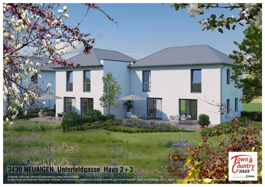 Wir errichten 3 Town & Country Einfamilienhäuser mit ca. 113m²-140m²Wohnfläche undGrundstücken mit ca. 600 – 800 m² im Baurecht auf 99 Jahre.Vorteile Baurechtseigentum:massive Erleichterung der FinanzierungTreuhandabwicklungGrundbuchabsicherungvolles Weitergaberecht (verkaufbar, vererbbar, verschenkbar)Sicherheit für 99JahreBaurecht € 269,-/monatlich (664m²)Das Projekt befindet sich in einer idyllischen Ruhelage umgeben von gepflegten Häusern und viel Grün.Die Gärten sind alle perfekt nach Westen ausgerichtet.Die Sonne begleitet Sie bis zum Abend auf der Terrasse. Das wird Sie begeistern.Das HausMassives Einfamilienhaus in Niedrigenergiebauweise mit ca. 113m²-140m² Nutzfläche und mit offenem Grundriss in belagsfertiger Ausführung.Inkludiert sind auch 2 Autoabstellplätze und die Zuleitungen. (lt. Leistungsbeschreibung).Im ERDGESCHOSS befinden sich:großzügige Kücheoffen gestalteter Wohn-/EssbereichHauswirtschaftsraumAbstellraum undGäste-WCIm OBERGESCHOSS befinden sich:ein Schlafzimmer mit begehbarem Schrankraumzwei weitere gleich große helle Zimmerein großes Badezimmer mit Badewanne und DuscheEbenso inkludiert sind (lt. Leistungsbeschreibung):Zu- und Ableitungen wie Kanal, Wasser und Strom samt Stromzählerkästen, Putzschächte, Wasserzählerschacht usw.Dachentwässerung samt Sickerschacht und Überlauf in den RegenwasserkanalAushub, BodengutachtenBefestigung der Zuwege und Autoabstellplätze (belagsfertig)Einreichplanung und Geometerkosten incl. GebührenLassen Sie den Traum von Ihrem eigenen Zuhause wahr werden und erwerben Sie dieses wunderschöne Einfamilienhaus in 3430 Neuaigen in Niederösterreich.Mit einem Kaufpreis von 437.500,- € bekommen Sie ein Haus mit 113m² Fläche und 4 Zimmern. Es ist ein Erstbezug, es hat 2 Stellplätze, 2 WCs, 2 Abstellräume, sowie Fußbodenheizung, Bad mit Fenster, Parkplatz, Luftwärmepumpe, Neubaustandard und ist ein Niedrigenergiehaus.Sie haben einen tollen Ausblick auf die grüne Landschaft.Das Haus bietet Ihnen ein perfektes Zuhause und die Verkehrsanbindung ist durch einen Bus gegeben. Mit diesem Einfamilienhaus erhalten Sie eine tolle Gelegenheit, Ihren Wohntraum zu verwirklichen.Nutzen Sie die Chance und erwerben Sie dieses schöne Einfamilienhaus in 3430 Neuaigen. Hier erhalten Sie ein modern ausgestattetes Haus mit allen Annehmlichkeiten und einem unvergleichlichen Ausblick. Erfüllen Sie sich Ihren Traum vom eigenen Zuhause und werden Sie glücklich, indem Sie dieses wunderschöne Einfamilienhaus erwerben.