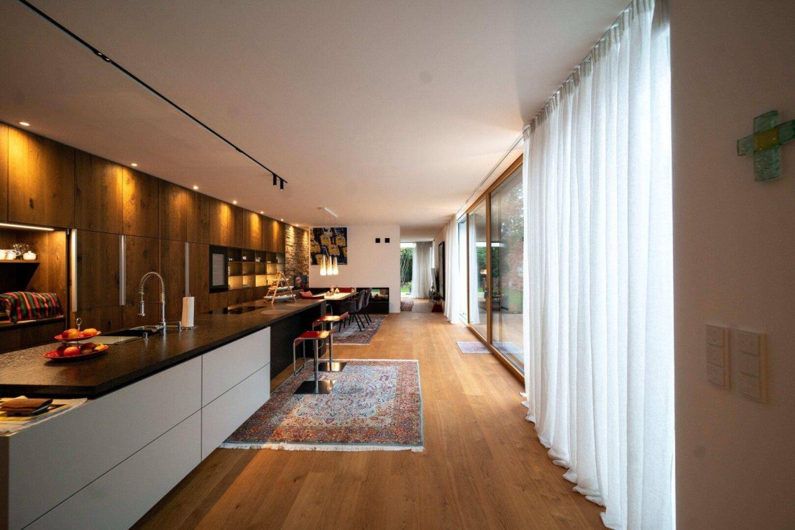 Stilvolles Designerhaus mit Homeoffice, Gästezimmer und Garten – Wohnen auf höchstem NiveauSind Sie auf der Suche nach einer Immobilie, die anspruchsvolles Design, komfortables Wohnen, Homeoffice-Möglichkeiten und großzügigen Raum für Gäste vereint? Dann wird Sie dieses exklusive Designerhaus aus dem Jahr 2019 begeistern.Willkommen zuhause – stilvoller Empfang mit PrivatsphäreBereits die private Einfahrt mit zwei überdachten Stellplätzen und ein eleganter Vorplatz unterstreichen den gehobenen Charakter dieser Immobilie. Der Zugang erfolgt über einen teils überdachten Gang, der an einem separaten Raum – ideal als Homeoffice oder Gästezimmer – vorbeiführt. Im Inneren empfängt Sie eine großzügige Garderobe mit viel Stauraum.Schlafbereiche mit WohlfühlambienteGleich gegenüber der Garderobe befindet sich das erste von zwei Schlafzimmern – ausgestattet mit begehbarem Kleiderschrank, stilvollem Designerbad und Zugang zur ersten von drei Terrassen. Am Ende des Flurs liegt das Hauptschlafzimmer mit eigenem Ankleidebereich und einem luxuriösen Bad inklusive Dampfdusche und Badewanne. Der Blick auf den idyllischen Garten sowie der direkte Zugang zur Terrasse sorgen für eine ganz besondere Atmosphäre.Kochen, Genießen, Leben – auf 90 m² Wohn-EssbereichDie offene, vom Tischler maßgefertigte Küche ist ein Highlight für alle, die gerne kochen und genießen – mit großzügiger Arbeitsfläche und edler Holzverarbeitung. Ein stilvoller Essbereich mit offenem Kamin bildet den Mittelpunkt und verbindet auf elegante Weise Küche, Wohnbereich und Bibliothek. Großzügige Glasfronten öffnen den Wohn-Essbereich zu zwei Terrassen – darunter eine rund 35 m² große Gästeterrasse mit reichlich Platz im Freien.Ausstattung, die keine Wünsche offen lässt:Nachhaltige Erdwärmeversorgung mit Wärmepumpe (Harreither)Deckenkühlung in Wohn-, Schlaf- und EingangsbereichenFußbodenheizung im gesamten HausSmarthome-Bussystem (Busch)Hochwertige Sanitärkeramik (Villeroy & Boch)Designer-Badewanne und Waschbecken (Caldewey)Armaturen von DornbrachtNatursteinböden (San Luca Kalkstein) in Flur, Garderobe und TerrassenGranit-Waschtische & Kaminverkleidung (Fa. Breitwieser, Tulln)3-fach verglaste Holz-Alu-Fenster mit Raffstores & Insektenschutz (Josko Platin-Serie)Raumhohe Innentüren (Josko Prado, Eiche natur)Geölter Eichenparkett (Josko Klassik, 2010 x 190 mm)Photovoltaikanlage für zusätzlichen EnergievorteilInteresse geweckt?Lassen Sie sich von diesem außergewöhnlichen Zuhause persönlich überzeugen.