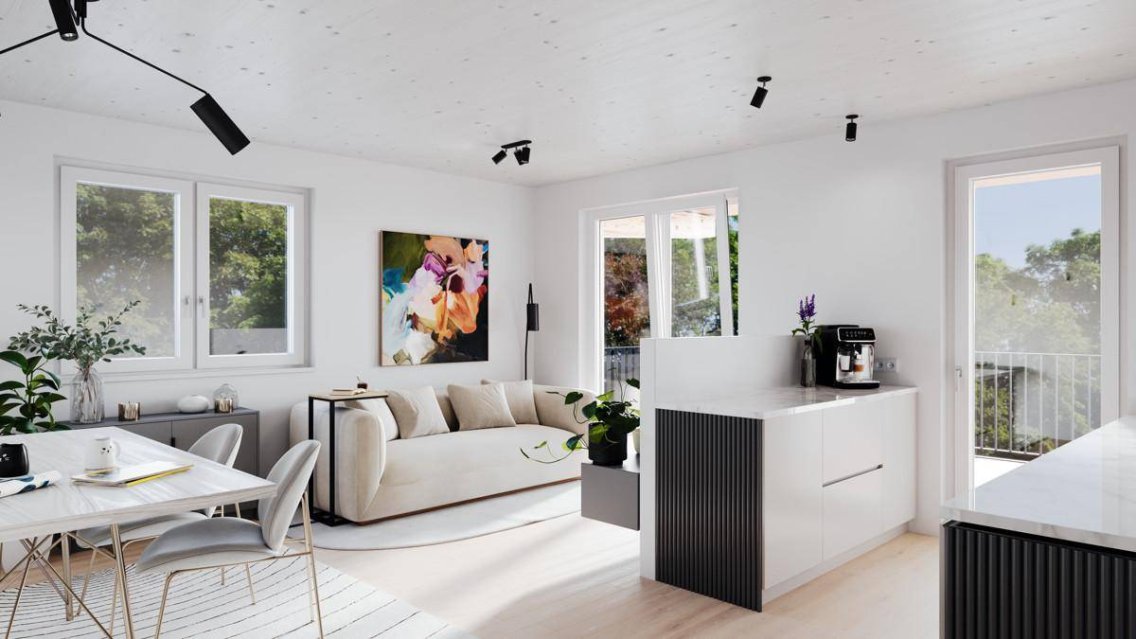 Die neun 1,5- bis 4-Zimmer-Wohnungen vereinen stilvolles Design mit nachhaltigem Holzbau. Große Fenster sorgen für viel Licht, während die natürliche Bauweise ein gesundes und angenehmes Raumklima schafft.