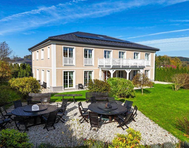 Vorfahren, ankommen … und in eine andere Welt abtauchen! Diese repräsentative Landhaus-Villa punktet mit vielen außergewöhnlichen Features: überdurchschnittliche große Räume, überdurchschnittliche große Verkehrsflächen wie zB. das Foyer, bzw die Dielen in UG und OG, wunderbar große Fenster sorgen für viel Lichteinfall, äußerst funktional organsierte Grundrisse auf allen Ebenen, technische Features wie Alarmanlage, PV-Anlage, BUS-Steuerung, LAN-Verkabelung etc. lassen keine Wünsche offen. Außerdem zieht sich eine hochwertige Materialisierung wie ein roter Faden durch das ganze Haus. Ursprünglich errichtet ca. im Jahr 2011, wurde der bisherige Edel-Rohbau vom jetzigen Eigentümer in 2023 hingebungsvoll bis in das letzte Detail vollendet. Dabei wurde u.a. auch größter Wert darauf gelegt, daß ergänzend zum Masterbereich noch mindestens 5 weitere, repräsentative Schlafzimmer … und ausreichend Bäder / WCs … geschaffen werden. Eines dieser Schlafzimmer sowie eines der Badezimmer befindet sich im EG, wodurch hier auch ein Leben auf einer Ebene problemlos möglich ist. Das EG empfängt einen mit einem großen Eingangsbereich mit separatem Garderobenraum. Direkt im Anschluss erstreckt sich das beeindruckende Foyer, von dem man direkt in den Salon gelangt. Rechts davon schließt ein weiterer Salon an, links davon hingegen öffnet sich das Speisezimmer mit anschließender, in sich geschlossener Küche und Schmutzküche. Die perfekte Raumaufteilung, um Gäste repräsentativ empfangen und infolge stilgerecht bewirten zu können – vom Apéritiv zum Dinner bis zum anschließenden Glas Cognac im „Cigar-Room“. Von jedem dieser drei Räume gelangt man in den nach Süden orientierten, uneinsehbaren Garten mit seinen diversen Sitzgelegenheiten. Das OG ist ganz den Schlafräumlichkeiten gewidmet. Auch hier gilt: viel Komfort, viel Platz, viel Licht. Der in sich geschlossene Master-Bereich, bestehend aus Schlafzimmer, Bad, WC und Ankleideraum, 3 -4 weitere Schlafzimmer, sowie 3 Bäder bieten jede Menge Platz für Kinder und Gäste. Das UG ist teils zu Wohnzwecken ausgestattet mit Parkett, Gästezimmer & -Bad, einem Hobbyraum … und wirklich großen Lagerflächen. Die Zufahrt auf das Grundstück und zur großen Doppelgarage (erbaut ca. 2023) eröffnet ein wunderschönes, handgeschmiedetes, automatisches Schiebetor.