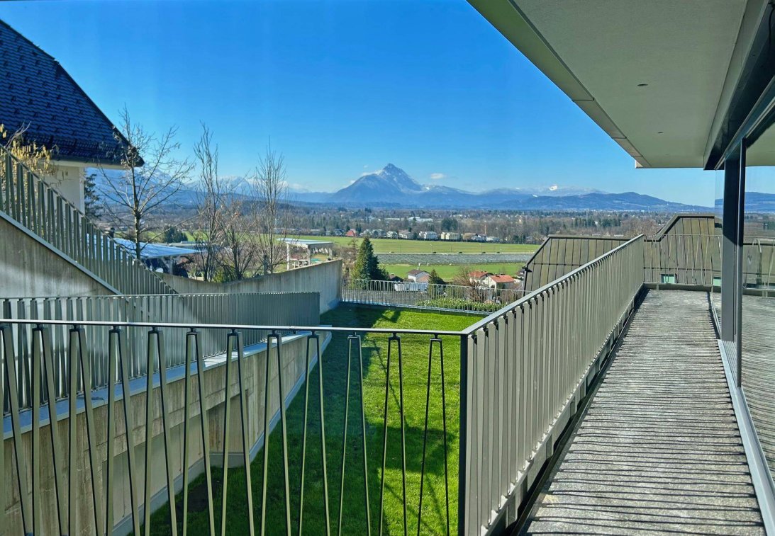 Die 4-Zimmer-Neubauwohnung im 1. Obergeschoss bietet nicht nur ein modernes und luxuriöses Wohnambiente, sondern auch eine herausragende Aussicht auf den Untersberg. Auf einer großzügigen Wohnfläche von etwa 153 m² und einer Terrasse von etwa 35 m² können Sie entspannte Abende und herrliche Sonnenuntergänge genießen. Der Wohnung ist ein Gartenanteil von ca. 18 m² zugeordnet. Die Immobilie bietet höchsten Wohnkomfort mit einem privaten Eingang und einem Aufzug, der direkt in die Wohnung führt. Beim Betreten der Wohnung gelangt man in eine großzügige Diele mit Garderobe. Am Ende des Ganges befindet sich das Hauptschlafzimmer mit Ankleidezimmer und einem geräumigen en-suite Badezimmer. Ebenfalls von der Diele aus erreichbar sind ein Abstell- bzw. Wirtschaftsraum sowie ein separates Gäste-WC. Das Herzstück der Wohnung bildet der ca. 59 m² große Wohn-/Essbereich mit offener Küche. Dank der großen Panoramafenster genießen Sie hier eine beeindruckende Aussicht und eine lichtdurchflutete Atmosphäre. Dieser Bereich lädt zum Entspannen ein und ermöglicht es, die Naturkulisse in vollen Zügen zu genießen. Vom Wohnzimmer aus gelangen Sie zu zwei Kinderzimmern, die jeweils über ein eigenes Badezimmer mit Dusche und WC verfügen.