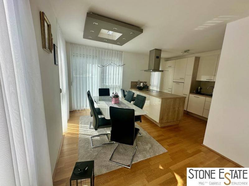 Der offene Wohn- und Essbereich bietet viel Raum für gemeinsame Zeit. Hier wird gekocht, gelacht und gelebt – mit direktem Zugang zur großen Dachterrasse, die den Wohnraum ins Freie erweitert.