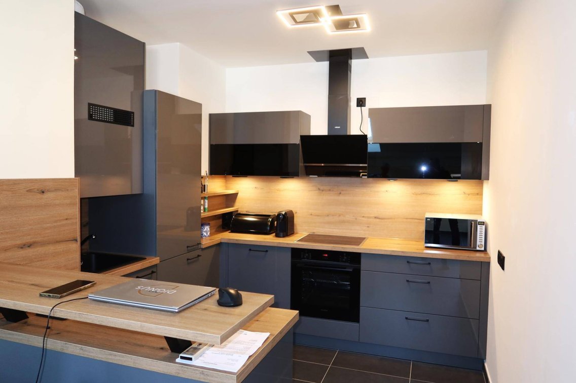Über den zentralen Vorraum gelangen Sie in das ca. 25 m² Wohnesszimmer mit offener neuer Einbauküche, in das Schlafzimmer, Kinderzimmer – Büro, sowie in das moderne Badezimmer mit bodenebener Dusche, Handwaschbecken und WM-Anschluss, in die separate Toilette und in den Abstellraum.