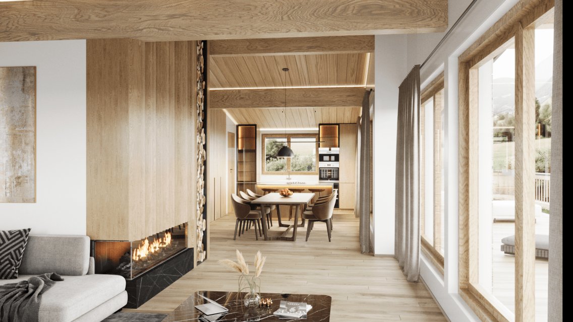 Durch die teilweise über 4 Meter tiefe Terrasse verschmilzt der Innenbereich mit dem Außenbereich, wo man die Choralpe samt umliegender Bergwelt in ihrer vollen Pracht bestaunen kann.