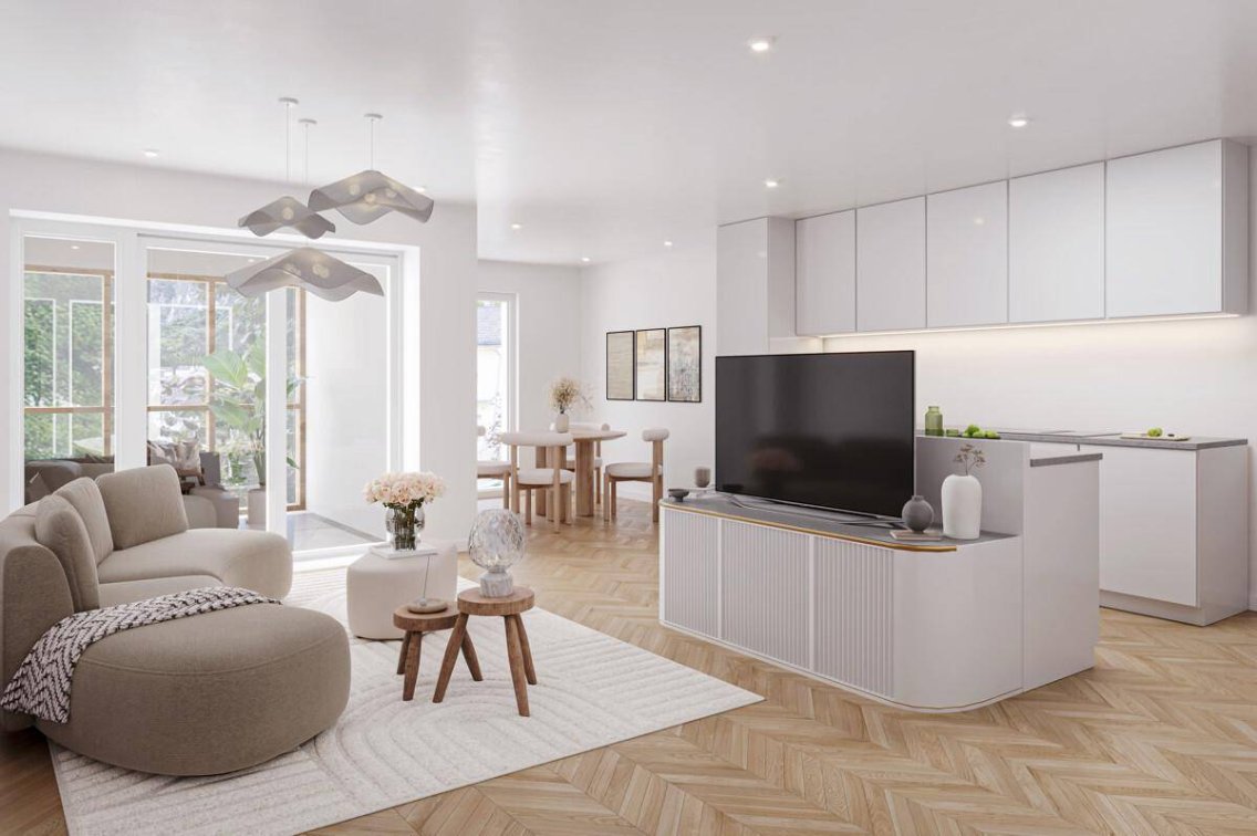 Qualität aus Leidenschaft: Im Inneren des Neubauprojekts steht hochwertiges Wohnen im Mittelpunkt: edle Materialien, zeitloses Design und eine durchdachte Ausstattung erzeugen ein behagliches Wohngefühl. Großformatige Glaselemente sorgen für viel Tageslicht und schaffen ein offenes Wohnambiente, während elegante Eichen-Massivholzböden für natürliche Wärme und Stil stehen. Die Nassbereiche sind mit exklusiven Marken-Armaturen von Hansgrohe sowie Villeroy & Boch sowie großflächigen Fliesen ausgestattet – ein klares Statement für moderne Architektur.