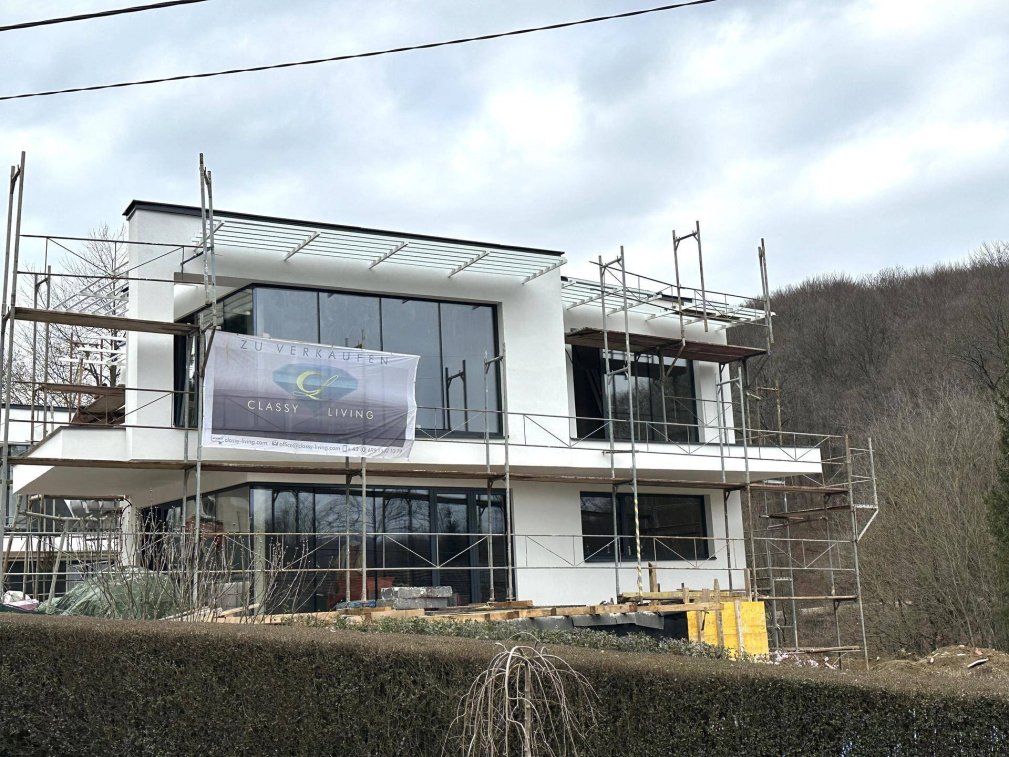 Repräsentativer Wohnsalon inkl. Kaminanschluss sowie großzügigen Glas-Eckflächen und Ausblick auf das große Schwimmbecken