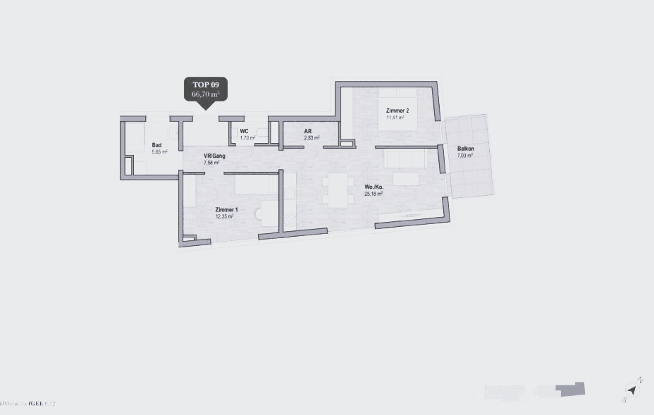 Mit einer Wohnfläche von 66,70 m² sowie einem Balkon mit 7,03 m² bietet sie modernen Wohnkomfort für Singles, Paare oder kleine Familien.• Wohnen / Kochen / Essen (25,18 m²):