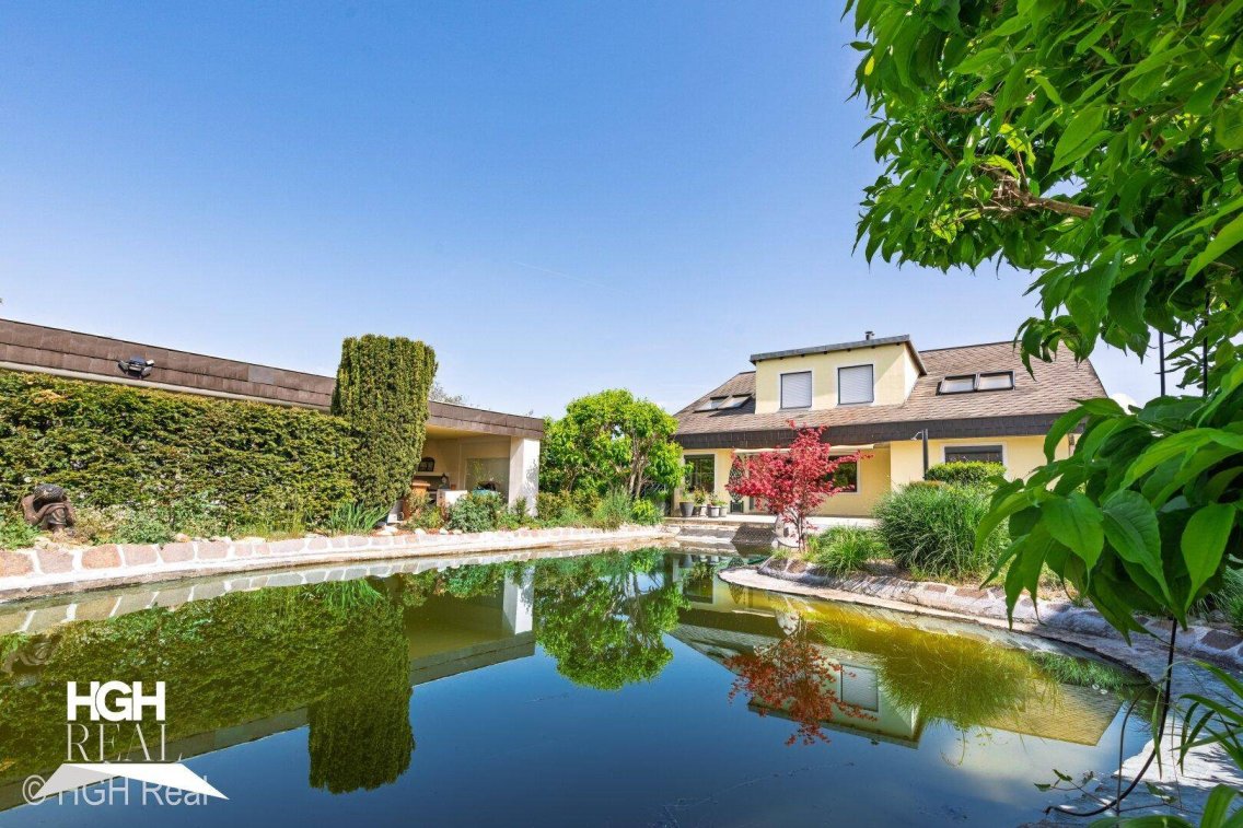 Diese elegante Villa mit ihrem uneinsichtigen, sonnigen Garten liegt in einer ruhigen Wohngegend von Korneuburg mit erstklassiger städtischer Infrastruktur, nur ca. 15 Gehminuten von Bahnhof sowie Hauptplatz entfernt. Der Garten mit seinem ca. 150 m² großen Schwimmteich mit vorgelagerter, großer Sonnenterrasse und Grillplatz sowie die Sauna im Keller bieten Ihnen eine Wellness-Oase für Ruhe und Erholung in den eigenen vier Wänden. Dank des nahegelegenen Bahnhofs und der hervorragenden Verkehrsanbindungen profitieren Sie hier außerdem von allen Vorteilen der Nähe zu Wien!Das Haus besteht aus 2 separat begehbaren Wohneinheiten und gliedert sich wie folgt:Erdgeschoß, ca. 130 m²:VorraumSehr großes Wohnzimmer mit Essplatz und gemütlichem KachelofenKücheWirtschaftsraumWCBadezimmer2 SchlafzimmerBegehbarer KleiderraumObergeschoß, ca. 125 m², über eine Außentreppe begehbar:GangBadezimmer mit WC3 SchlafzimmerWohnzimmerKüche mit EssbereichKeller, ca. 130 m²:Waschraum mit Dusche und WCVorraumAbstellraumGroßer Raum mit Sauna3 weitere Räume, teilweise als Werkstätten genutztTechnikraum mit Therme für das Erdgeschoß und Brunnen (direkter Zugang vom Garten)Außenbereich:Schwimmteich mit ca. 150 m² (ca. 2,5 m an der tiefsten Stelle)Große SonnenterrasseGrillplatz / überdachter Essplatz Garage – ca. 20 m² sowie CarportIm Keller befindet sich eine Wasseraufbereitungsanlage sowie ein Brunnen, der den Schwimmteich mit Wasser versorgt.2023 wurden die Dachflächenfenster im Obergeschoß mit 3-fach Verglasung erneuert und mit solargesteuerten Jalousien ausgestattet.In unmittelbarer Umgebung gibt es mehrere Supermärkte und einen Drogeriemarkt, zum Hauptplatz mit seinem vielfältigen Angebot an Einkaufsmöglichkeiten sind es nur 3-4 Min. per Auto.Korneuburg ist eine Stadtgemeinde mit ca. 14000 Einwohnern, ca. 10 km von der Wiener Stadtgrenze entfernt, mit ausgezeichneter Infrastruktur:Direkt in Korneuburg gibt es mehrere Kindergärten, Volksschulen, Mittelschulen und das Bundesgymnasium und Bundesrealgymnasium.Für das gesundheitliche Wohl sorgt ein breites Angebot an Ärzten und Fachärzten, ein Krankenhaus, Apotheken, Physiotherapie, etc.Für Freizeit und Erholung gibt es in Korneuburg ein breitgefächertes Angebot. Sportbegeisterte finden hier diverse Vereine und Anlagen für verschiedene Sportarten, u.a. Fußball, Handball, Beachvolleyball, Tennis, Gymnastik und einen Skaterplatz. Die Donauauen und die umliegenden Wälder laden zu verschiedensten Outdoor-Aktivitäten, wie NordicWalking, Fahrradtouren oder Laufen ein. Außerdem gibt es in Korneuburg ein reichhaltiges Angebot an Konzerten und Veranstaltungen, die Nähe zu Wien erweitert das kulturelle Angebot um unzählige Theater, Museen und Ausstellungen.Verkehrsanbindungen:Der Bahnhof Korneuburg liegt ca. 2-3 Fahrrad-Minuten von zu Hause entfernt, von dort erreichen Sie in ca. 12 Zugminuten den Bahnhof Floridsdorf mit U6-Anschluss bzw. in ca. 21 Zugminuten den Bahnhof Wien Praterstern mit U1 und U2 Anschlüssen.Über die Auffahrt Korneuburg Ost erreichen Sie in nur ca. 10 Autominuten die Wiener Stadtgrenze.Bei Interesse kontaktieren Sie mich bitte für weitere Informationen und zur Vereinbarung eines Besichtigungstermins:Hans Georg Homolatsch, Immobilienfachberater und Geschäftsführer HGH Real GmbH[E-Mail-Adresse entfernt], Mobilnummer: [Telefonnummer entfernt]Der Vermittler ist als Doppelmakler tätig.