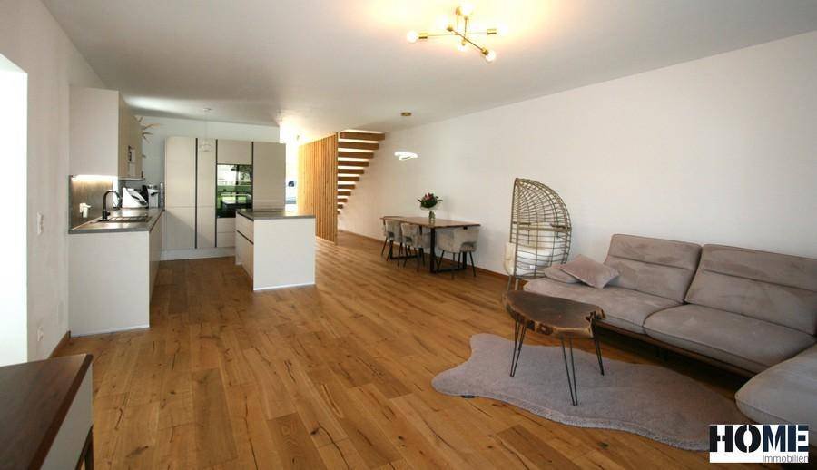 Durch den hellen, freundlichen Eingangsbereich, gelangen Sie in das ca 41m² lichtdurchflutete Wohnzimmer mit Platz für den Essbereich und der offenen, modernen Küche der Marke DAN mit Kochinsel und Siemens Einbaugeräten.