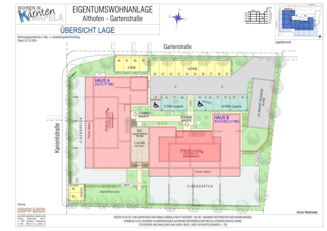 Es stehen insgesamt 60 PKW-Abstellplätze zur Verfügung, wobei 34 davon in der Tiefgarage untergebracht sind, und die restlichen sich in 9 Carports sowie 17 PKW-Abstellplätze im Freien aufteilen