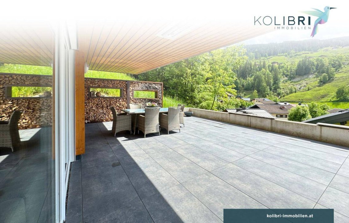 Alle Wohnräume bieten direkten Zugang zur Terrasse, von der aus sich ein herrlicher Blick auf die umliegenden Berge und die Natur eröffnet.