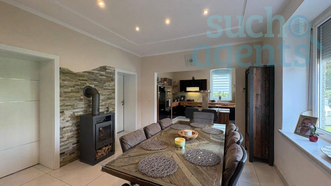 Die Immobilie verfügt über sechs Zimmer, darunter drei geräumige Schlafzimmer und zwei neue Badezimmer, die im Jahr 2022 vollständig erneuert wurden. Herzstück des Hauses ist das Wohnzimmer mit einem gemütlichen Kamin, der für eine behagliche Atmosphäre sorgt. Die Böden sind aus Laminat-, Fliesen- und Parkett. Besonders hervorzuheben ist die Fußbodenheizung im gesamten Erdgeschoss, die für zusätzlichen Wohnkomfort sorgt.