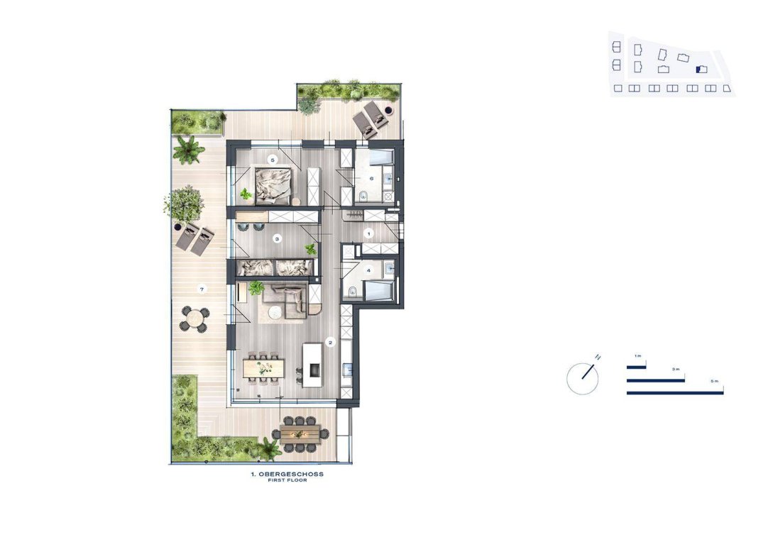 Ob als stilvoller Rückzugsort oder repräsentativer Lebensmittelpunkt – diese Wohnung vereint Großzügigkeit mit Raffinesse. Der offene Grundriss bietet Platz für Individualität, während die großzügigen Außenflächen Raum zum Durchatmen schaffen.