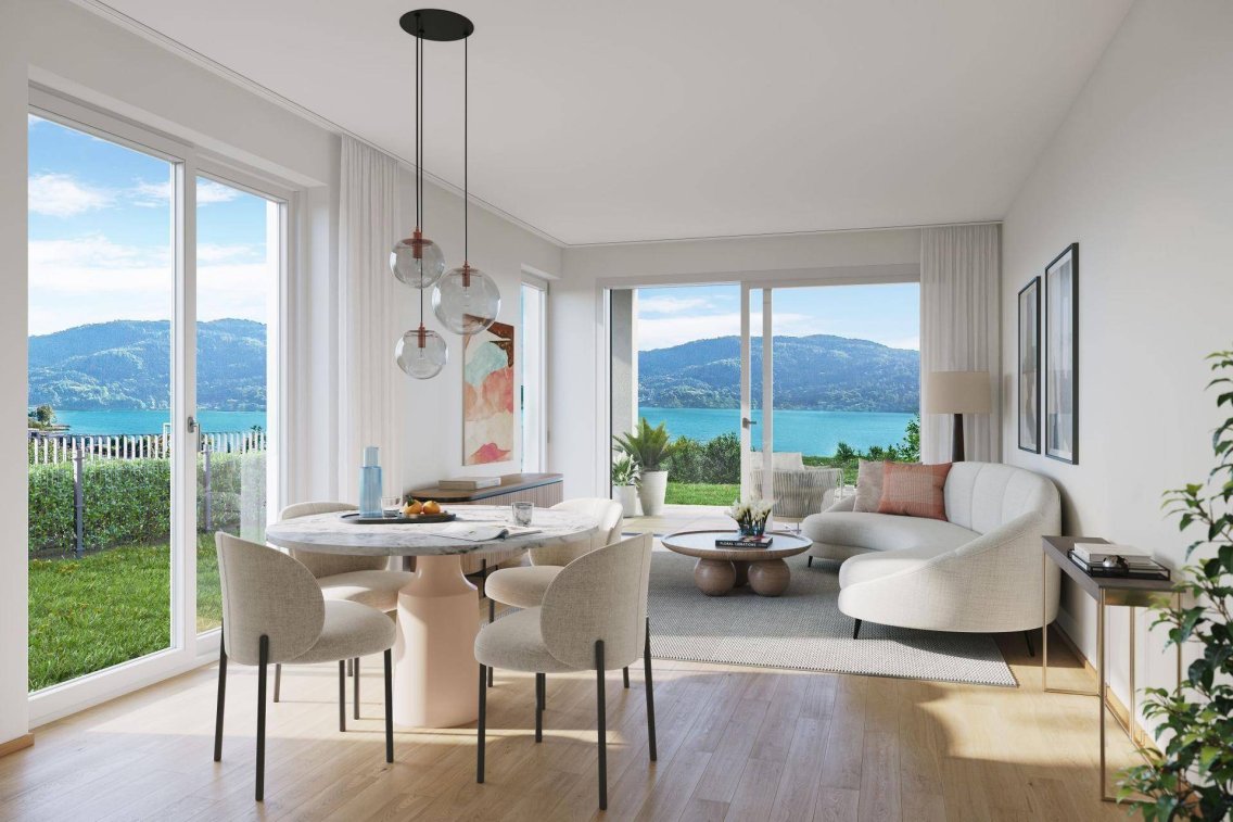 Diese besondere Wohnung im Erdgeschoss des Neubauprojekts SEEPANORAMA Pörtschach verbindet stilvolle Architektur mit naturnaher Lebensqualität.