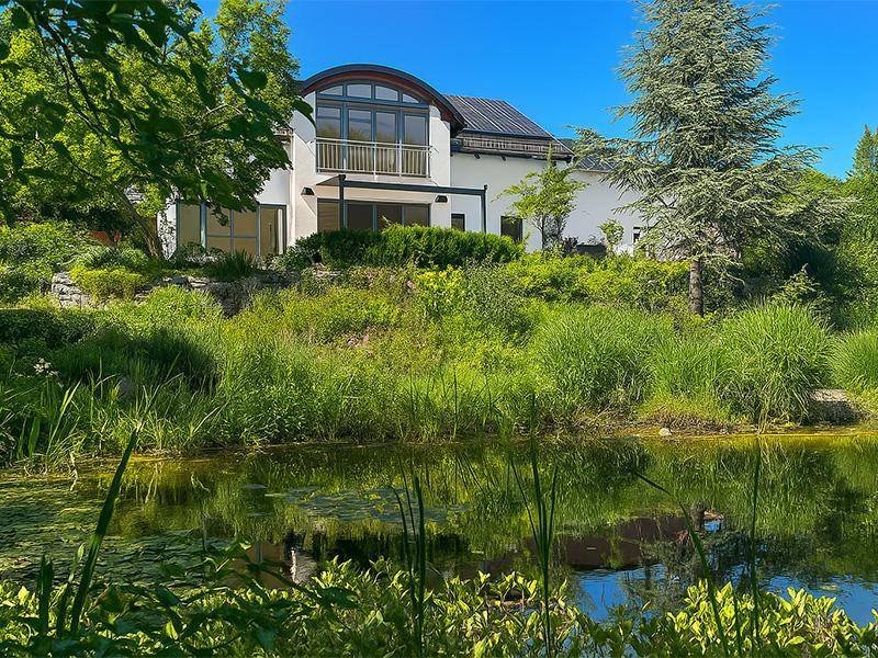 Dieses großzügige Einfamilienhaus vereint durchdachte Architektur mit einem besonderen Naturerlebnis. In ruhiger Siedlungslage gelegen – und dennoch von einem Gefühl wohltuender Abgeschiedenheit getragen – bietet es beeindruckende Ausblicke auf die umliegende, dicht bewaldete Hügellandschaft, absolute Privatsphäre und einen traumhaft angelegten Natur-Garten mit Schwimm-teich und wunderbaren Rückzugsbereichen. Das Haus wurde perfekt in die Hanglage integriert und öffnet sich auf ganz besondere Weise nach unten zum Garten. Schon beim Ankommen wird man von einem beeindruckend breiten Treppenlauf empfangen, welcher auf direktem Weg in die tieferliegende Wohn- und Gartenebene führt. Links am Fuß der Treppe, direkt unterhalb der Doppelgarage, liegt ein heller Raum mit großer Glastür in den Garten – ideal als Atelier, Homegym oder Hobbyraum. Dahinter befinden sich zwei geräumige Lagerräume. Hier wurde bereits eine Deckenöffnung für einen Warenlift vorbereitet - mühsames Schleppen ist passé. Rechts hingegen öffnet sich der eigentliche Wohnbereich: auf rd. 75m² gehen die Bereiche Wohnen, Speisen und Kochen fließend ineinander über; die Fläche ist zwar sehr offen gestaltet, aber so angenehm strukturiert, dass jeder Bereich für sich wirkt. Ein wunderbarer Wintergarten mit Ausgang auf Terrasse und Garten sowie eine praktische Speis, eine großzügige Garderobe und ein Gäste-WC vervollständigen das EG. Das EG ist großzügig umgeben von verschiedenen Terrassenflächen und bietet in Summe vier Zugange in das grüne Paradies. Das OG beherbergt zwei Schlafzimmer mit jeweils eigenem Schrankraum, Bad en suite und Balkon. Ergänzt wird das Raumangebot durch einen phantastischen Studiobereich mit raumhoher Fensterfront – prädestiniert als Homeoffice, Atelier oder Rückzugsort mit Ausblick. Im UG schließlich: ein heller Fitness- und Wellnessbereich mit Whirlpool und Dampfdusche, ein praktischer Hauswirt-schaftsraum sowie ein Gästezimmer mit Bad. Ein Haus mit Charme, Raum und Rückzug – gemacht für Menschen, die Wert auf Struktur, Natur und Lebensqualität legen.