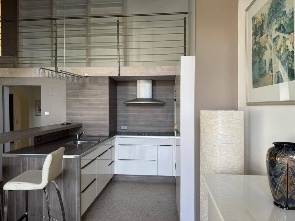 Das Herzstück der Wohnung bildet das großzügige Wohnzimmer mit integrierter Küche, das durch die hohe Raumhöhe eine besonders luftige und offene Atmosphäre schafft.