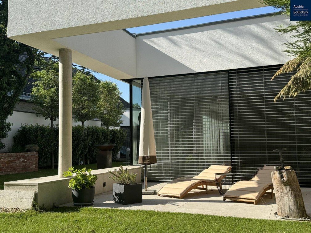 Dieses moderne Architektenhaus aus dem Jahr 2019 vereint auf elegante Weise exklusives Wohnen, repräsentatives Arbeiten und stilvolles Empfangen. Wer großzügige Raumkonzepte, hochwertige Ausstattung und architektonische Raffinesse schätzt, wird sich hier sofort zuhause fühlen.Schon die private Zufahrt mit überdachten Stellplätzen für zwei Fahrzeuge sowie einem großzügigen Vorplatz für Gäste vermittelt Exklusivität und Komfort. Der halbüberdachte Zugang führt vorbei am separaten Homeoffice mit integrierter Garage – ideal für Sammler, die ein Liebhaberstück wie einen Oldtimer stilvoll in Szene setzen möchten.Bereits der Eingangsbereich mit verglaster Fassade, knapp 2,80 Meter Raumhöhe und einem eindrucksvollen Galeriegang bietet Platz für Kunst und setzt ein klares Statement: Dieses Haus ist mehr als ein Zuhause – es ist Ausdruck von Persönlichkeit. Die angrenzende Garderobe punktet mit durchdachtem Stauraum und elegantem Design.Das erste der beiden Schlafzimmer – gleich gegenüber der Garderobe – verfügt über einen begehbaren Schrankraum, ein exklusives Designerbad sowie direkten Zugang zur ersten der insgesamt drei Terrassen. Das ruhig gelegene Hauptschlafzimmer am Ende des Gangs beeindruckt mit begehbarer Garderobe, Wellnessbad mit Dampfdusche und Badewanne und dem Blick ins Grüne – samt direktem Zugang zur Terrasse und dem liebevoll angelegten Garten.Das Herzstück des Hauses bildet der offene Wohn-Essbereich mit rund 90 m² Fläche. Die edle Tischlerküche mit massiver Arbeitsplatte und hochwertigen Holzfronten lässt keine Wünsche offen und geht fließend in den Essplatz über, der durch einen offenen Kamin vom gemütlichen Wohn-/Bibliotheksbereich getrennt ist. Zwei Ausgänge führen auf die großzügigen Terrassen, von denen die Gäste-Terrasse mit ca. 35 m² auch kulinarische Sommerabende im Freien zum Erlebnis macht.Noch nichts gefunden? Wir informieren Sie über geeignete Immobilienangebote noch vor allen anderen.