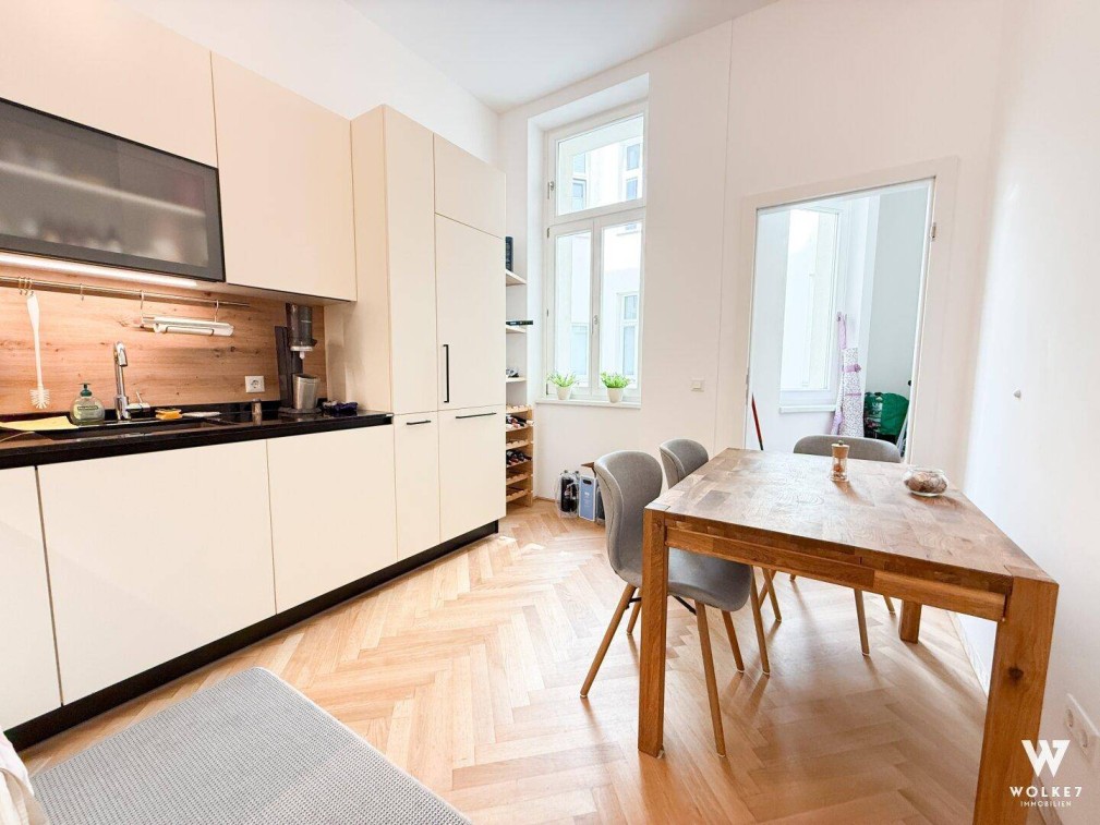 Diese exklusive, im Jahr 2022 kernsanierte Altbauwohnung vereint den unverwechselbaren Charme eines klassischen Wiener Altbaus mit modernstem Wohnkomfort – eine seltene Gelegenheit im Herzen des 5. Bezirks.Die Wohnung befindet sich im dritten Liftstock eines stilvoll revitalisierten Gründerzeithauses in der ruhigen Siebenbrunnengasse, unweit der Zentagasse. Die Südausrichtung zum Innenhof garantiert viel Tageslicht und gleichzeitig eine außergewöhnlich ruhige Wohnatmosphäre – mitten in der Stadt.Der rund 7 m² große, überdachte Balkon öffnet sich ebenfalls zum begrünten Innenhof und lädt zum Entspannen ein. Dank großzügiger Fensterflächen im Wohnbereich sowie zusätzlichem Lichtschacht bei der Küche ist die Wohnung überdurchschnittlich hell.Highlights der Ausstattung:Inklusive hochwertiger Einbauküche von Breitschopf (Oberösterreich) mit Markengeräten und eleganten SteinoberflächenFußbodenheizung in allen Räumen (betrieben mit Fernwärme Wien)Sommerkühlung über das Heizungssystem, individuell steuerbar via RaumthermostatAltbauflair mit 3,15 m Raumhöhe in allen Aufenthaltsräumen und edlem Eichen-FischgrätparkettAußenjalousien (Alulamellen) mit Fernbedienung für optimalen SonnenschutzModernes Bad mit Glasdusche, hochwertigen Armaturen (Grohe, Diana) und feuchtigkeitsgesteuertem AbluftsystemSeparates WC mit Ausstattung von GeberitPraktische Speisekammer und ein großzügiger Abstellraum (ca. 3 m²)Zusätzliches Kellerabteil mit ca. 3,4 m²Glasfaseranschluss verfügbar (A1, Magenta)Gebäudekomfort & Gemeinschaftseinrichtungen:Großzügiger Fahrradraum und Fahrradstellplätze im InnenhofModerner Gemeinschaftsfitnessraum mit hochwertiger Geräteausstattung (u.a. Laufband, Rudergerät, Kraftgeräte)Personenlift im HausTiefgaragenstellplatz:Ein zur Wohnung gehörender Tiefgaragenstellplatz kann zusätzlich um EUR 25.000 erworben werden. Der Kauf erfolgt nur in Kombination mit der Wohnung.Provision: 3 % des Kaufpreises zzgl. 20 % USt. (nur im Erfolgsfall beim Kauf)Individuelle Finanzierungsberatung: Wir bieten Ihnen eine unverbindliche und kostenlose Beratung zu möglichen Finanzierungsmodellen. Gerne unterstützen wir Sie bei der optimalen Finanzierung Ihrer Traumwohnung!Besichtigung und weitere Informationen: