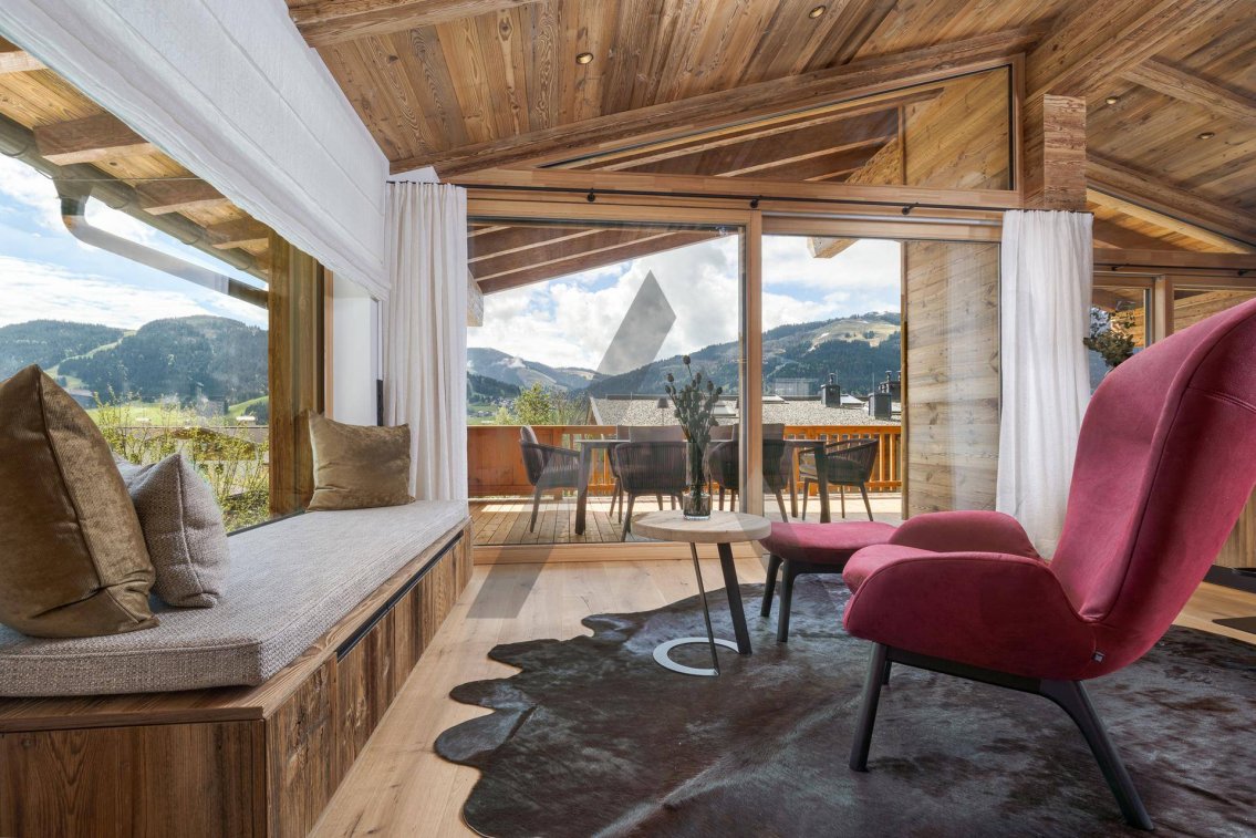 Der große Wohnbereich mit Altholzsichtdachstuhl, modernster Küche, und Essbereich mit Kamin erstreckt sich über das gesamte Dachgeschoss. Die großzügigen Balkonflächen laden dazu ein, den wunderschönen Ausblick auf die Berge und in die Umgebung zu genießen.