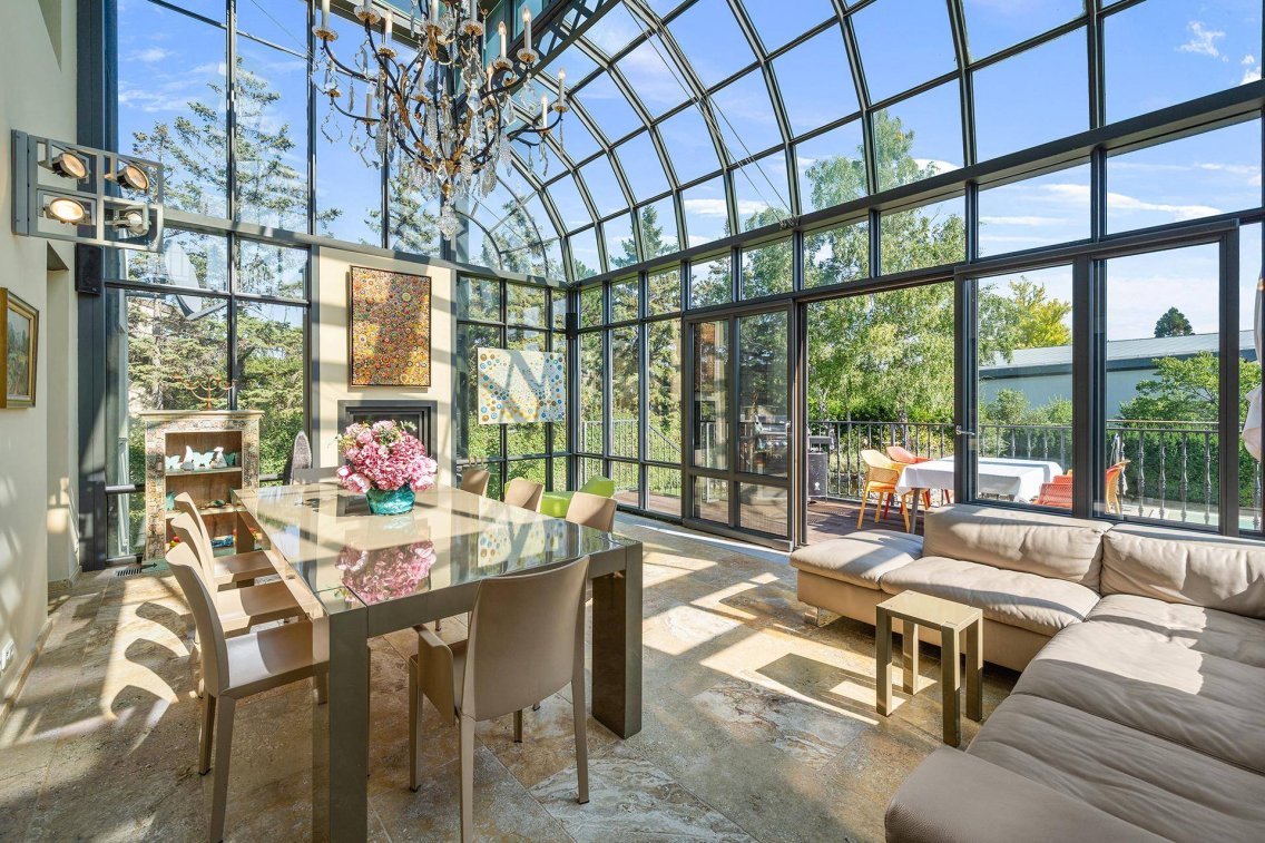 Im Erdgeschoss befinden sich neben dem Eingangsbereich mit Garderobe ein weitläufiges Wohnzimmer mit offenem Kamin, eine top ausgestattete Küche mit Kücheninsel und Weinkühlschrank und ein Büro. Abgerundet wird dieses Stockwerk von einem der zahlreichen Highlights des Hauses - dem fünf Meter hohen Wintergarten auf der Südseite.