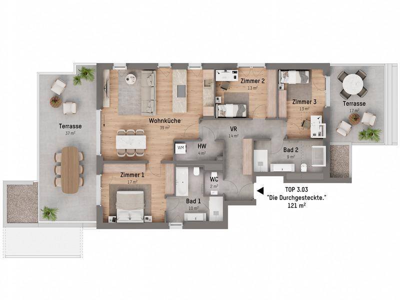 • Hochwertige Markenausstattung (Echtholzparkett, Feinsteinzeug-Fliesen, Holz-Alu-Fenster mit 3-fach Isolierverglasung, uvm.)