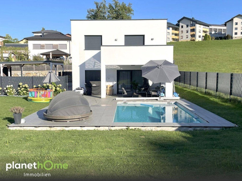 Dieses Traumhaus mit Pool und Garten in absoluter Ruhelage bietet Ihnen eine Wohnfläche von ca. 132 m² auf höchstem Niveau an. Das erst 2022 (Erstbezug) erbaute Haus in massiver Bauweise mit hochwertigen Materialien, ist der Traum für jeden Immobilienbesitzer.