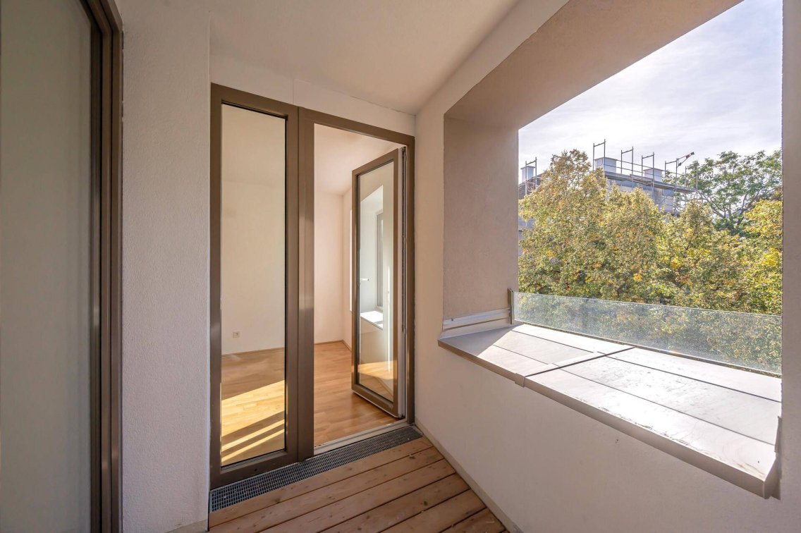 Modernes Wohnen kombiniert mit traumhaftem Blick ins Grüne: Ein geräumiger Wohn-Essbereich bietet nicht nur viel Platz für gemütliche Stunden, sondern auch direkten Zugang zu einer Loggia, die zum Entspannen einlädt. Die separate Küche sorgt für zusätzlichen Komfort und grenzt den Wohnbereich angenehm ab. Für außergewöhnliches Wohnambiente und optimale Lichtdurchflutung sorgen große Fensterflächen, welche direkte Ausblicke in die Baumkronen des Minna-Lachs-Parks bieten.