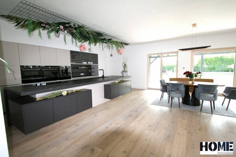 Durch den Eingangsbereich gelangen Sie in das große, lichtdurchflutete Wohnzimmer mit bequemen Essbereich. Hier ist auch die traumhaft schöne, neuwertige DAN-Küche mit hochwertigen Siemens Geräten (Induktionsherd mit integriertem Dunstabzug (nach außen), Kaffeemaschine, Backofen mit pyrolyse Funktion, Geschirrspüler, Kühl/Gefrierschrank) integriert.