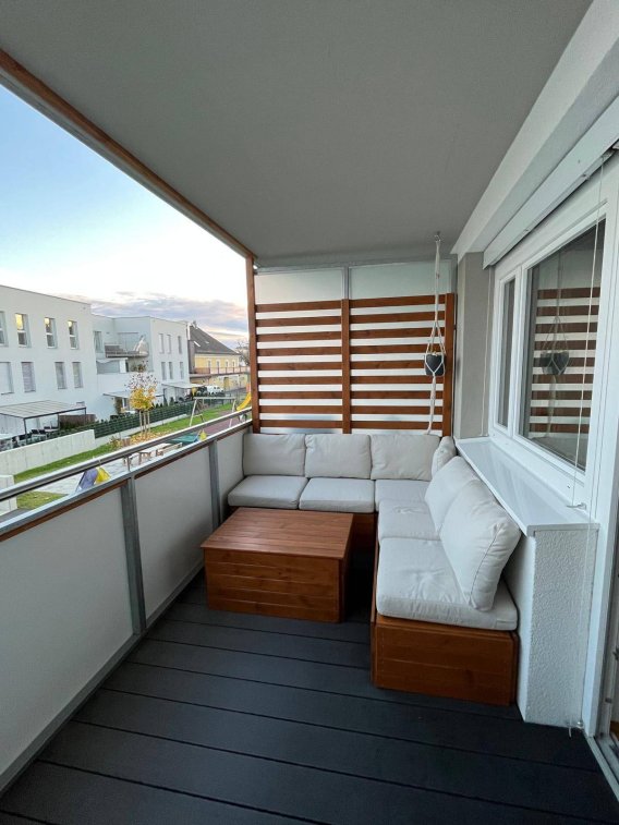 Der 11 m² große Balkon wurde katzensicher vernetzt und bietet einen perfekten Platz zum Entspannen.