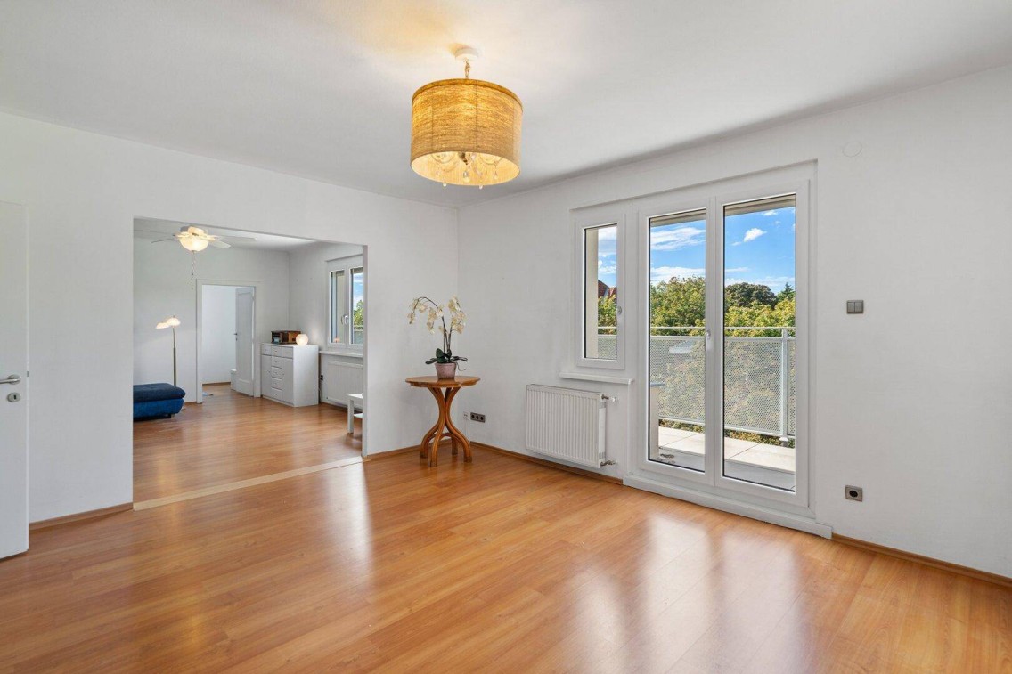 Ganz oben mit Traumausblick...... so lässt sich die wunderschöne Wohnung zuerst einmal treffend beschreiben. Vom gepflegten Hauseingang (Sanierung 2022 - Dach, Stiegenhaus, Balkone, Kellerabteile) erreicht man über das sympathische Stiegenhaus oder mit dem Lift das Licht durchflutete Dachgeschoß des Wohnhauses. Hier betritt man die charmante, großzügige Wohnung, in der man sich vom ersten Augenblick an wohl fühlt. Das geräumige Vorzimmer hat alles was man braucht: Ausreichend Platz für die Garderobe, einen Abstellraum, eine Toilette und am Ende des Flures ein großes Bad mit Wanne und Dusche. Weiter geht es vom Vorraum in den ersten der beiden Wohnräume mit angeschlossener Küche und Ausgang auf den traumhaften Süd-Balkon (ca. 30qm) mit Ausblicken ins Grüne soweit das Auge reicht. Hier lässt es sich herrlich frühstücken, relaxen oder abends ein Glas Wein genießen. Die Küche ist bereits eingerichtet und funktionstüchtig. Von diesem Wohnraum eröffnet sich ein weiterer Wohnraum, der ebenso nach Süden ausgerichtet und auch vom Vorzimmer erreichbar ist. Dieser Raum kann bei Bedarf wieder vom ersten Wohnraum abgetrennt werden. Neben diesem Raum befindet sich ein Kabinatt, welches derzeit als Schlafzimmer genutzt wird. Mittels 3 unterschiedlicher relativ leicht umsetzbarer Grundrissvarianten ist diese Wohnung auch Familien-tauglich!Diese Wohnung ist weit mehr als nur ein Ort zum Wohnen – sie ist ein Rückzugsort, an dem Sie sich jeden Tag rundum wohlfühlen können. Dank der idealen Lage im Grünen und zugleich gut angebundenen 19. Bezirk ist sie perfekt geeignet für Paare und Singles, die Lebensqualität und urbanes Flair verbinden möchten.Highlights: Ruhelage in einer Sackgasse, viel Sonne für Sonnenhungrige, elektrische Jalousien, neue Gas-Therme, neuer Balkon.Achtung: Der Plan entspricht nicht dem tatsächlichen Zustand nach der letzten Wohnungssanierung. Freier Mietzins kommt zur Anwendung!!Rücklage zum 31.12.2024: € 48.193,65 (aktuell etwas niedriger aufgrund großer Sanierungsmaßnahmen in den letzten beiden Jahren).BK inkl. BK Lift, Ust, Rücklage: € 432,08, Strom/Gas nach Verbrauch.Allgemeine Hinweise:Für weitere Fragen bzw. zur Vereinbarung von Besichtigungsterminen stehen wir Ihnen unter der Telefonnummer [Telefonnummer entfernt] zur Verfügung oder Sie senden uns ein Anfrage-Mail an [E-Mail-Adresse entfernt]. Besuchen Sie auch unsere Homepage https://pe-immo.at, wo Sie interessante Objekte und Immobilien-Tipps finden. Wir freuen uns auf Sie!