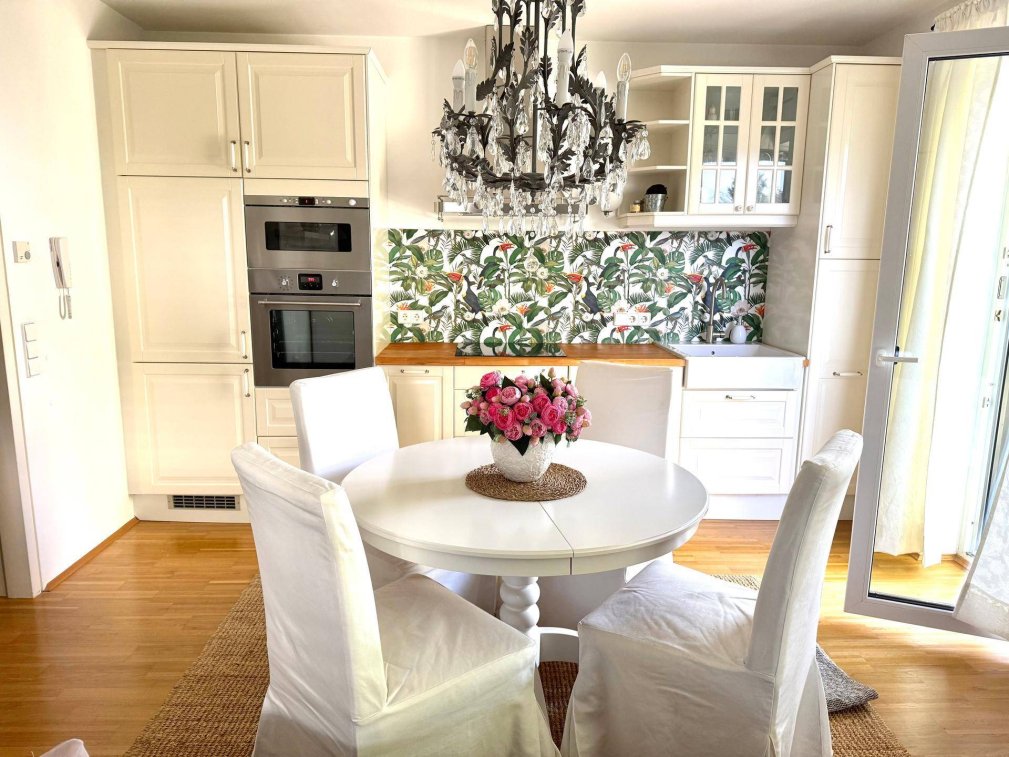Die Wohnung verfügt über ein Badezimmer und ist mit Parkettböden sowie einer Einbauküche ausgestattet. Die Wohnung kann auf Wunsch teilmöbliert übernommen werden. Besonders hervorzuheben sind die 40 m² große Terrasse und der 90 m² große Garten, die zum Entspannen im Freien einladen. Die Immobilie bietet zudem einen Carport-Stellplatz. Zur Ausstattung gehören Fußbodenheizung mit Fernwärme sowie ein Aufzug im Gebäude, was den Komfort für die Bewohner:innen erhöht.