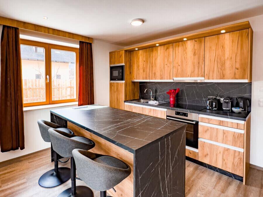 Das Herzstück des Chalets bildet die geräumige, offene Einbauküche, die keine Wünsche offenlässt und nahtlos in den Wohnbereich übergeht. Hochwertige Bodenbeläge aus Laminat und Fliesen unterstreichen das elegante Ambiente. Entspannen Sie auf der beeindruckenden, 110 m² großen Terrasse die perfekt für gesellige Abende unter freiem Himmel geeignet ist.