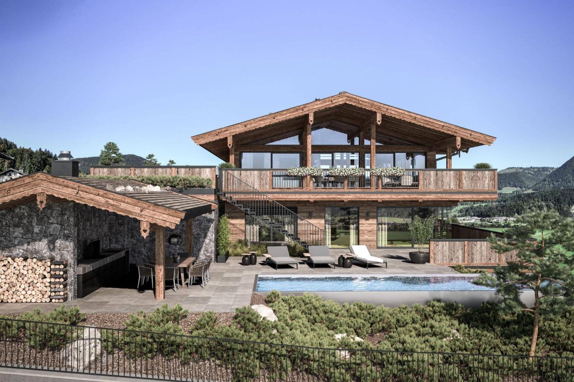 Durch die geschickte Integration traditioneller und bäuerlicher Elemente in eine zeitgemäße Architektur könnte hier in Kürze schon eine Atmosphäre von zeitloser Eleganz und Wärme geschaffen werden. Die genehmigte Chalet-Planung sieht eine Wohn- und Nutzfläche von ca. 727 m² vor und schafft damit Raum für exklusives Wohnen auf höchstem Niveau. Im Inneren erwartet Sie ein offener Wohn- und Essbereich im Dachgeschoss mit spektakulären Raumhöhen, die ein Gefühl von Weite und Freiheit vermitteln. Großzügige Terrassen- und Balkonflächen von etwa 476 m² eröffnen vielfältige Möglichkeiten für erholsame Stunden im Freien, besonders mit dem atemberaubenden, freien Ausblick auf die umliegende Berglandschaft, die für einzigartige Naturschauspiele sorgt. Vorgesehen sind fünf bis sechs Schlafzimmer, fünf luxuriöse Bäder sowie ein hochwertiger Wellnessbereich mit Sauna, Ruhezonen und Fitnessmöglichkeiten. Ein besonderes Highlight des Chalets ist zweifellos der Outdoorpool auf der privaten Sonnenterrasse, flankiert von einem überdachten Freisitz mit Outdoorküche und Lounge. Zudem bieten ein bis zwei Einliegerbereiche ausreichend Raum für Gäste und runden das Raumkonzept hervorragend ab. Modernste Haustechnik hebt den Wohnkomfort auf höchstes Niveau und eine Doppelgarage sowie drei Carportstellplätze stehen Ihnen für Ihren Fuhrpark zur Verfügung.