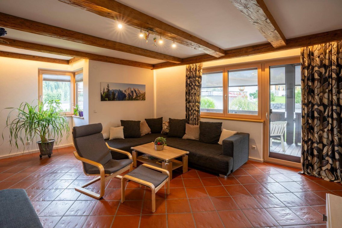 Im geräumigen, hellen Wohnzimmer befindet sich ein Kachelofen der für gemütliche Stunden in der kalten Jahreszeit sorgt. Der große süd-ost-seitige Balkon mit Senkrechtmarkisen lädt dafür in der warmen Zeit zum Verweilen ein. Durch einen offenen Rundbogen gelangt man in die Küche mit Essbereich. Diese wurde 2019 renoviert und qualitativ hochwertig sowie zeitlos eingerichtet.