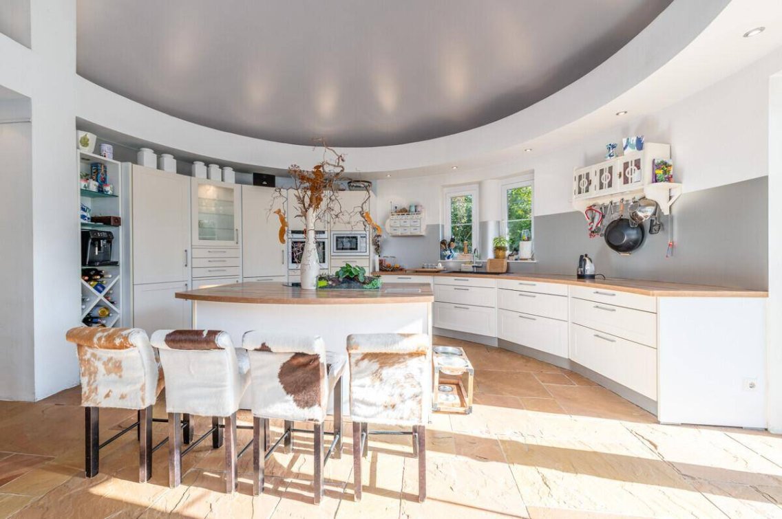 Zwei Rundräume bilden das Herzstück des Hauses und setzen ein kraftvolles architektonisches Statement. Sie wirken wie aus der Natur herausgewachsen, fügen sich sanft in den sie umgebenden Garten und schaffen eine Wohnatmosphäre, die zwischen futuristischer Vision und urtümlicher Geborgenheit liegt. Hier wurde nicht einfach ein Haus gebaut - hier wurde ein Lebensgefühl gestaltet.