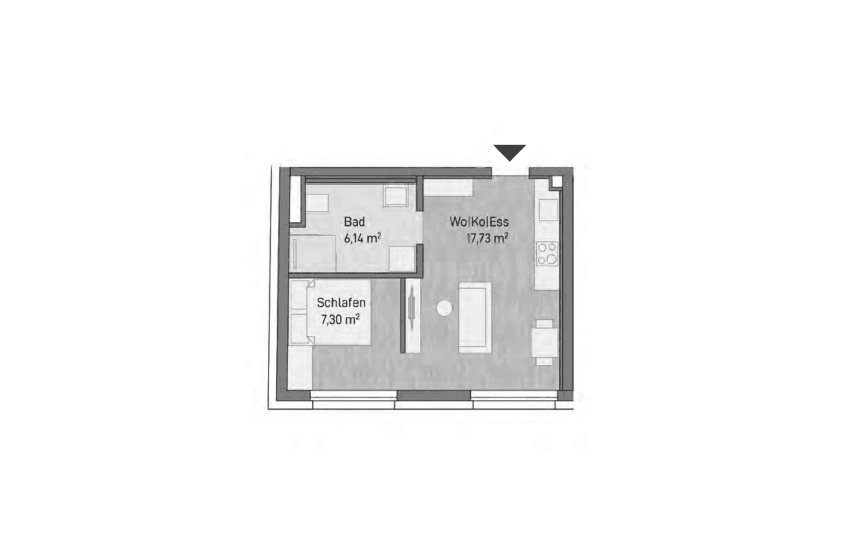 Die Wohnung kommt ohne Balkon aus – dafür wird der vorhandene Wohnraum maximal effizient genutzt.