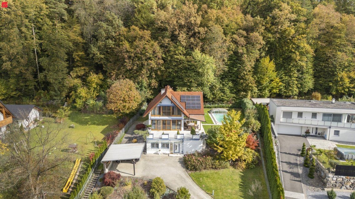 Schon beim Betreten offenbart sich die durchdachte Architektur und das harmonische Zusammenspiel aus Glas, Licht und Raum. Großzügige Glasfronten schaffen ein lichtdurchflutetes Ambiente und bringen die traumhafte Aussicht direkt ins Wohnzimmer.Der moderne Eingangsbereich mit Gäste-WC führt in den offenen, großzügigen Wohn- und Essbereich, der durch elegante Glasfronten, eine stilvolle Raumhöhe und den direkten Zugang sowohl zur sonnigen Westterrasse als auch zum ruhigen Garten begeistert. Hier genießen Sie absolute Privatsphäre – das angrenzende Waldstück sorgt für idyllische Ruhe – und der Pool lädt zu entspannten Stunden in der Sonne ein.Im Obergeschoss setzt sich das exklusive Wohngefühl fort: Das Sonnenschlafzimmer mit stilvoller Einrichtung, begehbarem Kleiderschrank und Zugang zum Ostbalkon verspricht jeden Morgen den perfekten Start in den Tag – mit Kaffee und Blick über den Pool.