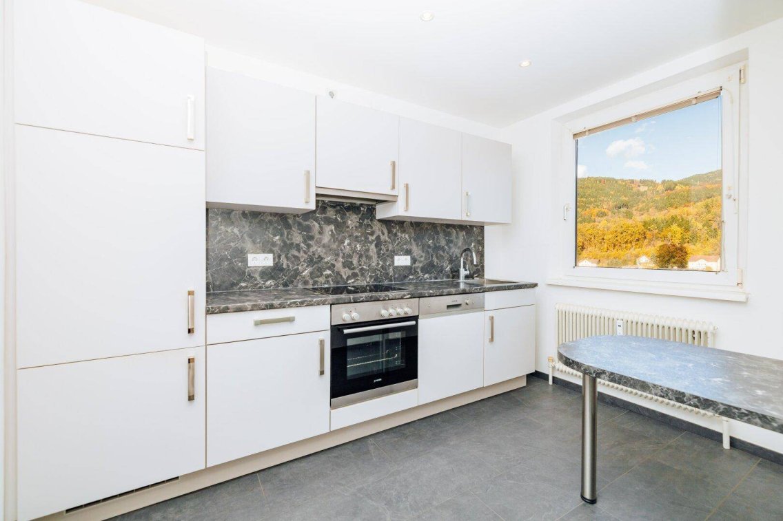 Durch die erhöhte Lage und die vielen Fenster genießt man ganztägig eine helle Wohnatmosphäre und einen weiten Blick über die Dächer von Leoben.Separate Küche mit Vollausstattung