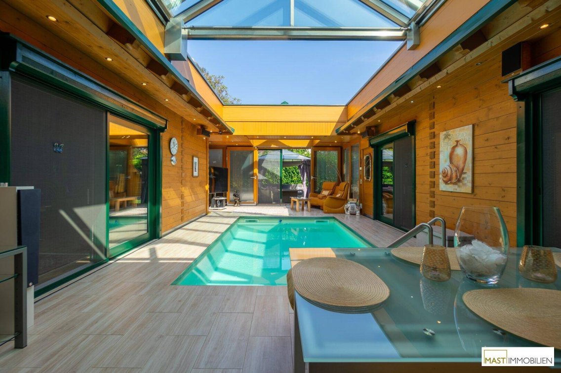 Errichtungsjahr: 2006Highlights der Liegenschaft:uneinsichtiger Garten / absolute Privatsphäre Pool im Innenbereich mit 5 x 3 m inkl. HeizungSauna/Solarium & ebenerdige Dusche + DoppelwaschbeckenPhotovoiltakanlage 10 kwDoppelgarageCarportEinbauküche inkl. Geräte3 fach verglaste Holz/Alu Fenster + Sonnen- & Insektenschutzuvm.Raumaufteilung: (Plan ersichtlich)