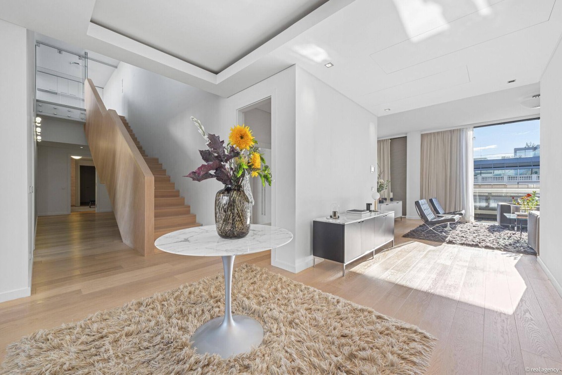 Die großzügige Wohnfläche von rund 300 m² verteilt sich auf lichtdurchflutete Räume mit hohen Decken, luxuriösen Materialien und einem zeitlos-eleganten Interieur. Herzstück der Residenz ist der weitläufige Wohn- und Essbereich mit direktem Zugang zur atemberaubenden Dachterrasse – mit Blick über die Dächer Wiens bis hin zum Stephansdom.