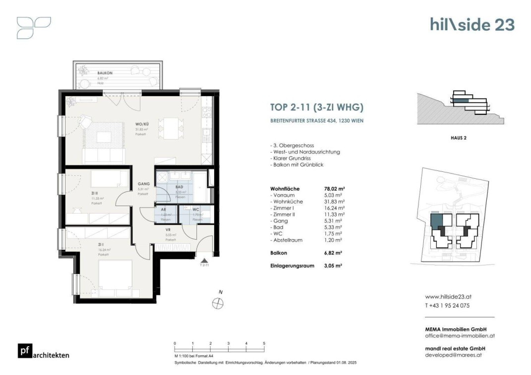 Bus: 253, 259 – Wien Rodaunbrücke (Breitenfurter Straße) (4 Gehminuten)Die 78,02 m²-Wohnfläche bietet wie folgt: