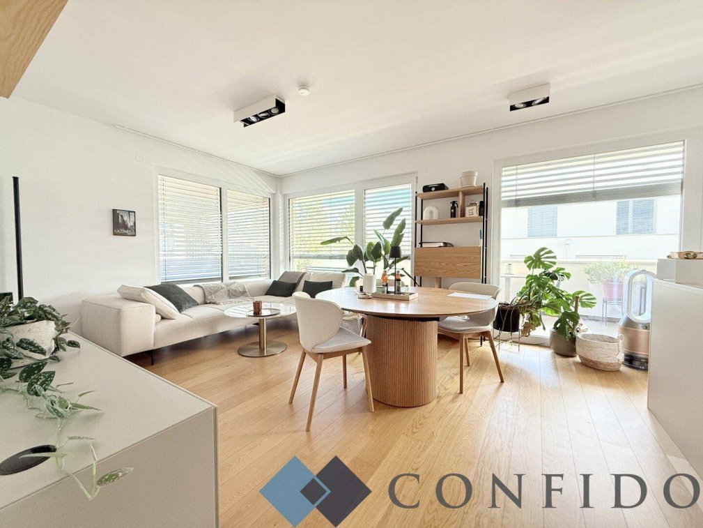 Ein Stellplatz in der hauseigenen Tiefgarage ist im Kaufpreis enthalten.Das Zentrum der Wohnung bildet die rund 28 m² große Wohnküche, die ausreichend Platz für einen Wohn- und Essbereich bietet und durch ihre große Fensterfront viel Tageslicht erhält. Die maßgefertigte Küche mit Kochinsel ist mit hochwertigen Geräten (u.a. Bosch, Bora) ausgestattet und fügt sich harmonisch in den Raum ein. Von hier aus gelangt man auf den großzügigen Balkon, der zum Entspannen und Genießen einlädt. Alle Räume sind über den weitläufigen Vorraum direkt begehbar. Das etwa 15 m² große Schlafzimmer öffnet sich zur rund 10 m² großen Terrasse (ca. 6,8m² Terrasse, 4m² Kies), die einen ruhigen Rückzugsort im Freien bietet.Das Badezimmer ist elegant gestaltet und verfügt sowohl über eine bodengleiche Dusche, einen Waschtisch als auch über eine großzügige Badewanne. Ein praktischer Abstellraum mit Waschmaschinenanschluss befindet sich neben der Küche. Ergänzt wird das Raumangebot durch ein rund 10 m² großes Zimmer, das sich ideal als Arbeits- oder Gästezimmer eignet, sowie durch eine separate Toilette. Ein geräumiges Kellerabteil sorgt für zusätzlichen Stauraum.