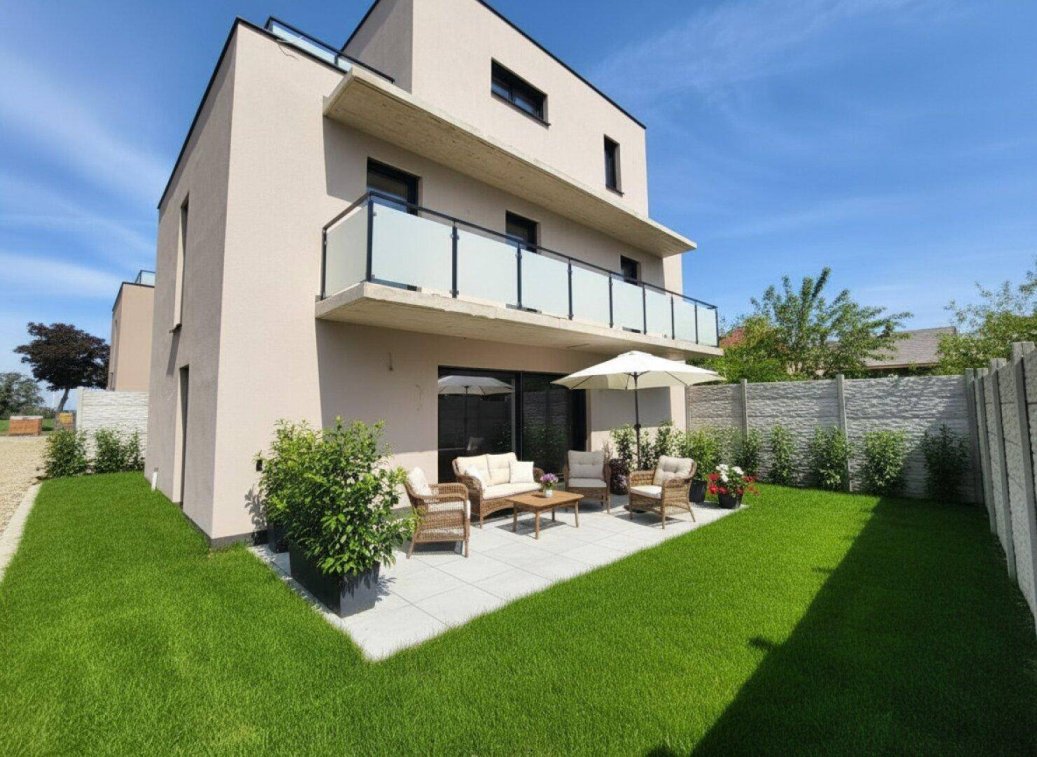Entdecken Sie modernes Wohnen inmitten einer traumhaft schönen Umgebung. Die 6 Einfamilienhäuser bieten nicht nur Platz für die ganze Familie, sondern schaffen auch ein Fundament für Jahrzehnte, das Ihrem Lebensmittelpunkt eine solide Basis verleiht.Jedes Haus wurde mit durchdachter Planung und hochwertiger Ausstattung konzipiert. In Ziegelbauweise errichtet und energieeffizient der Klasse B entsprechend, garantieren Luft/Wärmepumpen inklusive Fußbodenheizung ein angenehmes Wohnklima zu jeder Jahreszeit.Genießen Sie die Sonne auf Ihren wunderschönen Außenflächen – ob im eigenen Garten oder auf der nach Süd/Ost ausgerichteten Terrasse. Die großzügigen Fenster und Terrassentüren mit Wärmeisolierverglasung und Rollläden sorgen für ein helles und behagliches Ambiente.Parken Sie komfortabel mit 2 eigenen Stellplätzen direkt am Grundstück.Die Häuser sind belagsfertig – die goldene Mitte der Ausbaustufen. Während einige Arbeiten wie Streichen, Fliesen- und Bodenverlegen noch auf Sie warten, ist der Großteil der Montage bereits abgeschlossen. Hier haben Sie die Möglichkeit, selbst Hand anzulegen und Ihrem neuen Zuhause eine persönliche Note zu verleihen. Wir stehen Ihnen dabei gerne beratend zur Seite und bieten Ihnen Unterstützung bei der Materialauswahl durch unsere erfahrenen Partner.Die großzügige Raumgestaltung mit 5 Zimmern und 3 Bädern, eine großzügige Wohnküche sowie der schöne Eigengarten machen diese Häuser zu einem idealen Ort für Familienleben und Entspannung gleichermaßen. Dank hochwertiger Grundausstattung, erstklassiger Baustoffe und einer durchdachten Planung bieten wir Ihnen Wohnqualität auf höchstem Niveau.Freuen Sie sich auf nachhaltige Extras, die Ihren Wohnkomfort weiter steigern: Von der hochwertigen Fassade über die energieeffiziente Heizungsanlage bis hin zu den langlebigen Fenstern und Türen – hier wurde an alles gedacht, um Ihnen ein Zuhause zu bieten, in dem Sie sich rundum wohlfühlen können.Erleben Sie das Beste aus moderner Architektur und durchdachtem Wohnkonzept – vereint zu Ihrem neuen Zuhause. Wir laden Sie herzlich ein, Teil dieses exklusiven Projekts zu werden und Ihren Wohntraum zu verwirklichen.Freuen Sie sich auf nachhaltige Extras:Bei der Realisierung des Neubaus wurde großen Wert auf eine hochwertige Ausstattung sowie langlebige Materialien gelegt:25 cm Planziegel und 20 cm Wärmedämmverbundsystem Fassade (geringer Heizwärmebedarf = geringe Heizkosten)Zwischenwände ZiegelLuft/Wärmepumpe mit 300 l Warmwasserspeicher in Kombination mit einer Fußbodenheizung Flachdachausführung gemäß Dachdeckerrichtlinien als WarmdachDie Fenster und Terrassentürelemente sind aus weißen Kunststoff-Alu-profilen - Wärmeisolierverglasung. Sonnenschutz durch elektrische Rollladen und Raffstore.Eingangstüre ist aus Aluminiumprofilen mit einer Dreifachverriegelung, Falzdichtungen und Sicherheitsbeschlag, anthrazit beschichtet.2 Autoabstellplätze Terrasse, Balkon und EigengärtenAbstellraum 3 BäderPV Vorbereitung + KlimavorbereitungUvm.Infrastruktur:Die Lage und die Nahversorgung ist ausgezeichnet. In unmittelbarer Nähe befinden sich diverse Einkaufmöglichkeiten und öffentliche Anbindungen.Bus Bahnhof Deutsch WagramEnergieausweis:Der Heizwärmebedarf 36,4 kWh/m2a (fGEE: 0,61, Kl. A+) entspricht der Klasse B.Kaufpreis Haus 5:Der Kaufpreis beläuft sich auf 599.000, -- € zzgl. 2 Stellplätze zu je 15.000, -- €.Provision: 3% des Kaufpreises zzgl. 20% USt.Für Fragen bzw. Besichtigungen steht Ihnen Herr Kevin Gödel sehr gerne unter [Telefonnummer entfernt] oder [E-Mail-Adresse entfernt] zur Verfügung.Die verwendeten Fotos weisen teilweise KI-generierte Inhalte auf.Wir weisen darauf hin, dass zwischen dem Vermittler und dem zu vermittelnden Dritten ein familiäres oder wirtschaftliches Naheverhältnis besteht.Der Vermittler ist als Doppelmakler tätig.