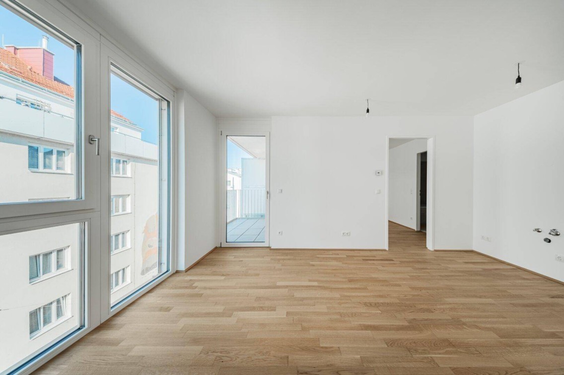Dank dem modernen Grundriss ist die Wohnung sehr geräumig und lässt viel Spielraum zum Gestalten Ihres neuen Zuhauses offen.Die Raumaufteilung gliedert sich wie folgt:Vorraum mit angrenzendem Abstellraum und separatem WCWohnküche (ca. 18 m²) mit direktem Zugang zum Schlafzimmer sowie zum BalkonSchlafzimmer (ca. 10,5 m²) mit Zugang zum Badezimmer sowie zum BalkonBadezimmer mit Badewanne, Handwaschbecken Handtuchwärmer und WaschmaschinenanschlussBalkon (ca. 4 m²) mit Nordwest-AusrichtungKellerabteil im UntergeschossDer besonders günstig gelegene Standort der verkehrsberuhigten Einbahnstraße "Fahrbachgasse", die fließend in die Begegnungszone der dort angesiedelten Bildungseinrichtungen über geht, verleiht dem Objekt den gewissen Charme mit all seinen Vorzügen. AUSSTATTUNG DER WOHNUNGbodentiefe Holz-Alu-Fenster mit 3-fach Isolierverglasungelektrische Raffstores für die äußere Beschattunghochwertiger Echtholz Eichenparkettboden aus ÖsterreichAnschlüsse für Küche mit StarkstromFeinsteinzeug 30 x 60 cm der Firma MarazziArmaturen der Marke DornbrachtKeramik in Bad und WC der Marke Laufen "Pro" Balkon mit Sichtschutz, Steckdose, Außenbeleuchtung und Wasseranschluss Ein Garagenplatz in der hauseigenen Tiefgarage kann zusätzlich erworben werden.