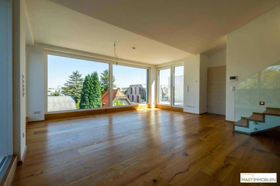 Nach Eintritt in die Wohnung gelangen Sie in ein XXL-Wohnzimmer ausgestattet mit einer hochwertigen Einbauküche inkl. Geräte. Bei dieser Wohnung wurde auf nichts vergessen. Großflächige Fenster bieten einen gigantischen Blick weit über den Dächern Wiens. Über den in der Wohnung vorhanden Aufgang gelangen Sie 2 weitere Schlafräume mit ebenfalls großzügigen Glasflächen, diese lassen sich natürlich über elektrische Raffstores abdunkeln bzw. bieten Ihnen Privatsphäre. Der Zugang auf die östliche Freifläche bietet das kleinere Schlafzimmer, dass sowohl als Kinderzimmer oder Home Office genutzt werden kann. Ein modernes Bad mit ebenerdiger Dusche, Waschbecken und Handtuchheizkörper veredelt das Objekt desto mehr. Das WC mit Waschbecken ist natürlich separat begehbar. Der WM-Anschluss befindet sich im Abstellraum.• Vorraum/Eingangsbereich