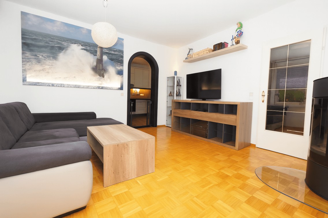 Das Herzstück der Wohnung bildet der helle Wohnbereich mit gemütlichem Schwedenofen – perfekt für entspannte Abende mit der Familie.